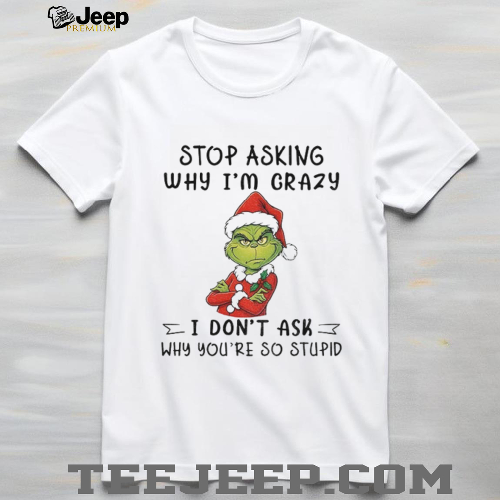 Ever get tired of explaining yourself? This Grinch Santa hat shirt perfectly captures that feeling! Featuring the Grinch in a Santa hat, it says “stop asking why I’m crazy I don’t ask why you’re so stupid.” It is for those who embrace their quirky side and have a sense of humor.
