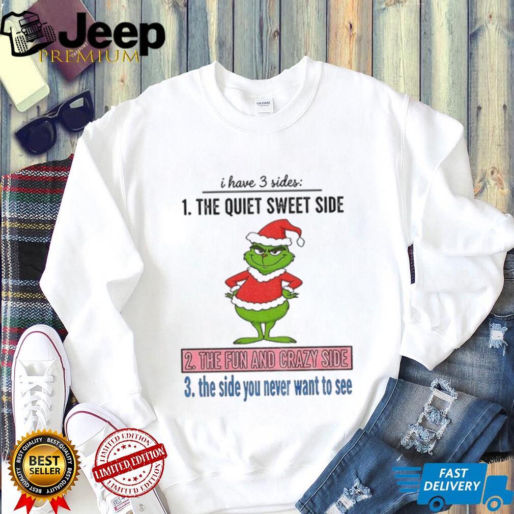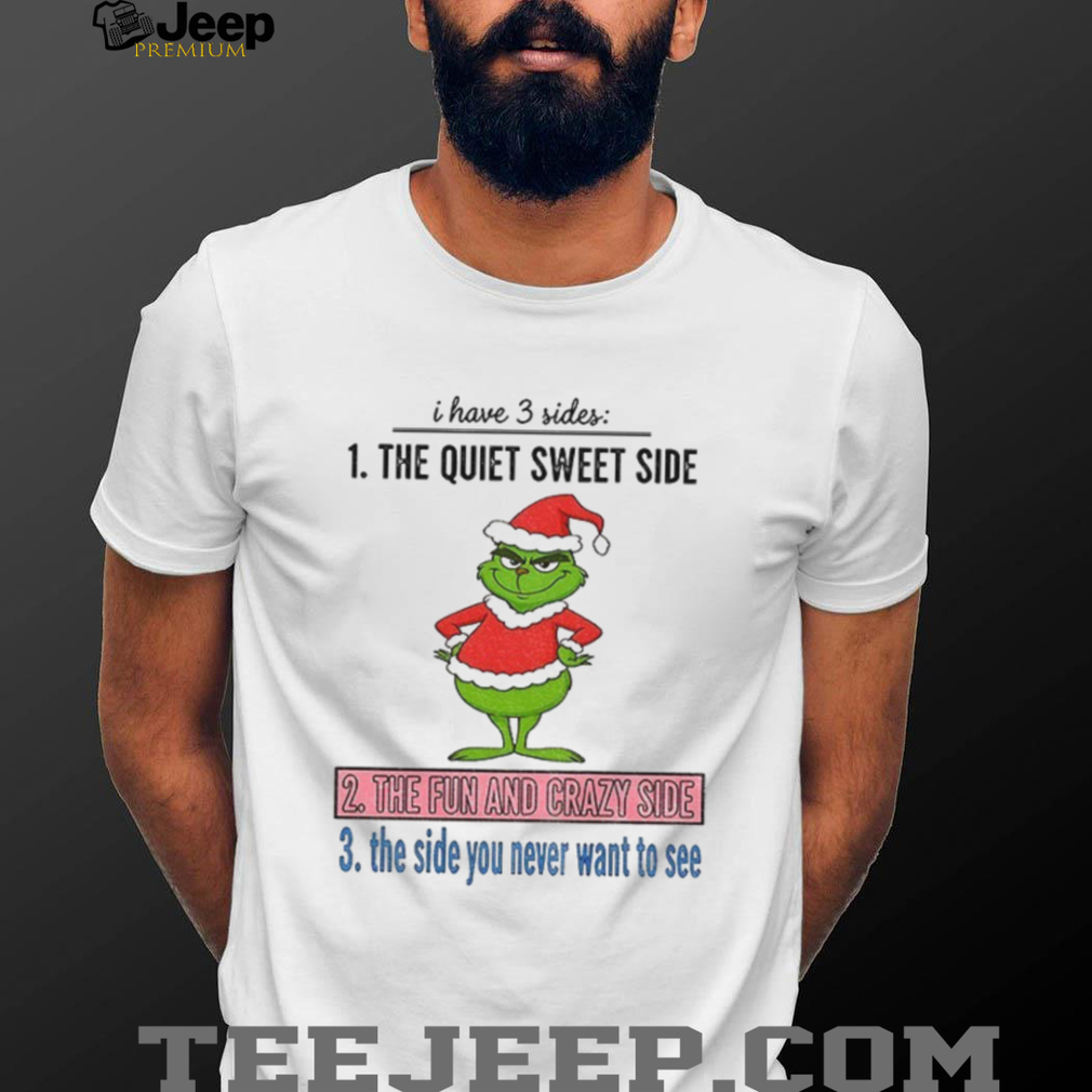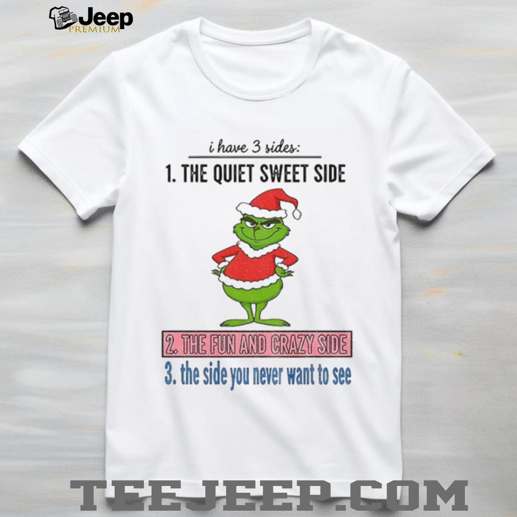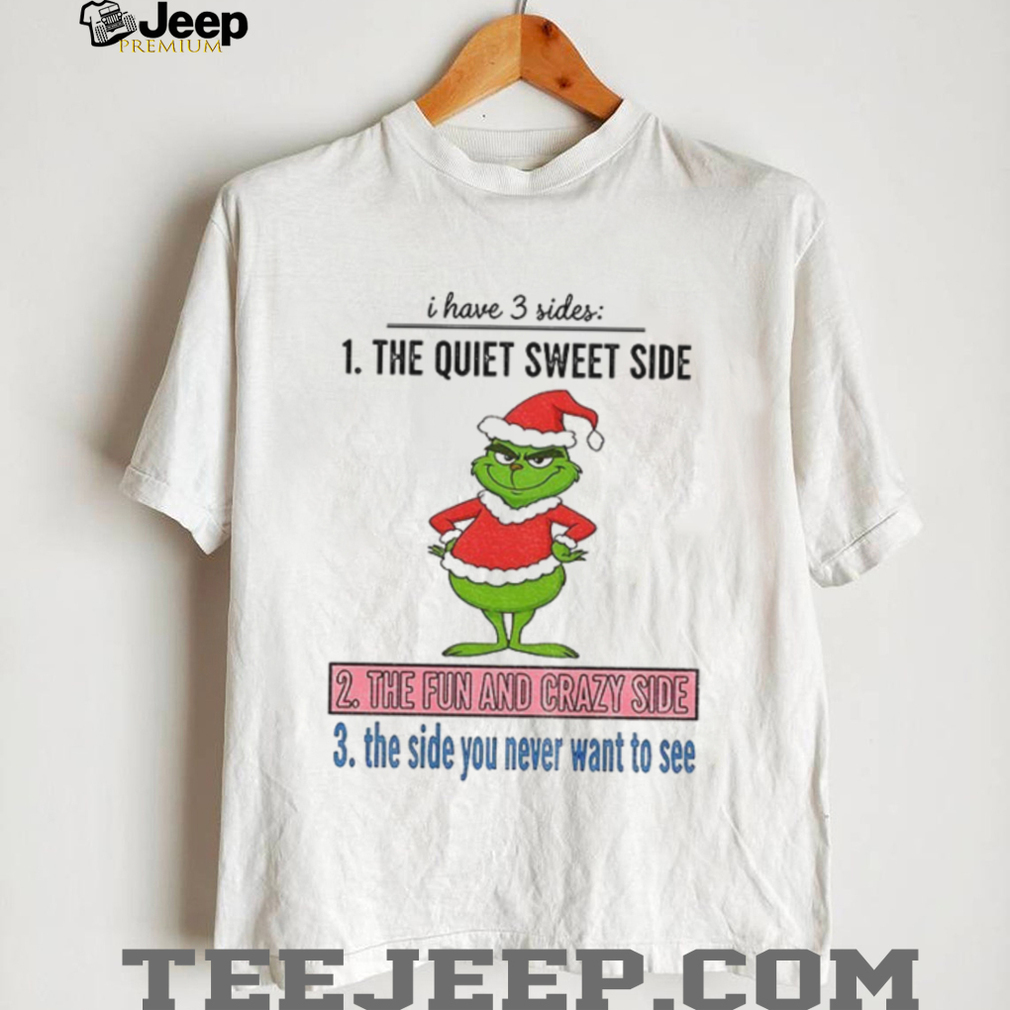 Unleash your inner festive spirit with this hilarious “Grinch Santa I have 3 sides” T-shirt! Are you sweet, fun, and a little crazy? Then this shirt is for you. Perfect for those who love the Grinch, Santa, and a good laugh during the Christmas season. Get ready to celebrate the holidays in style with this unique and fun design.