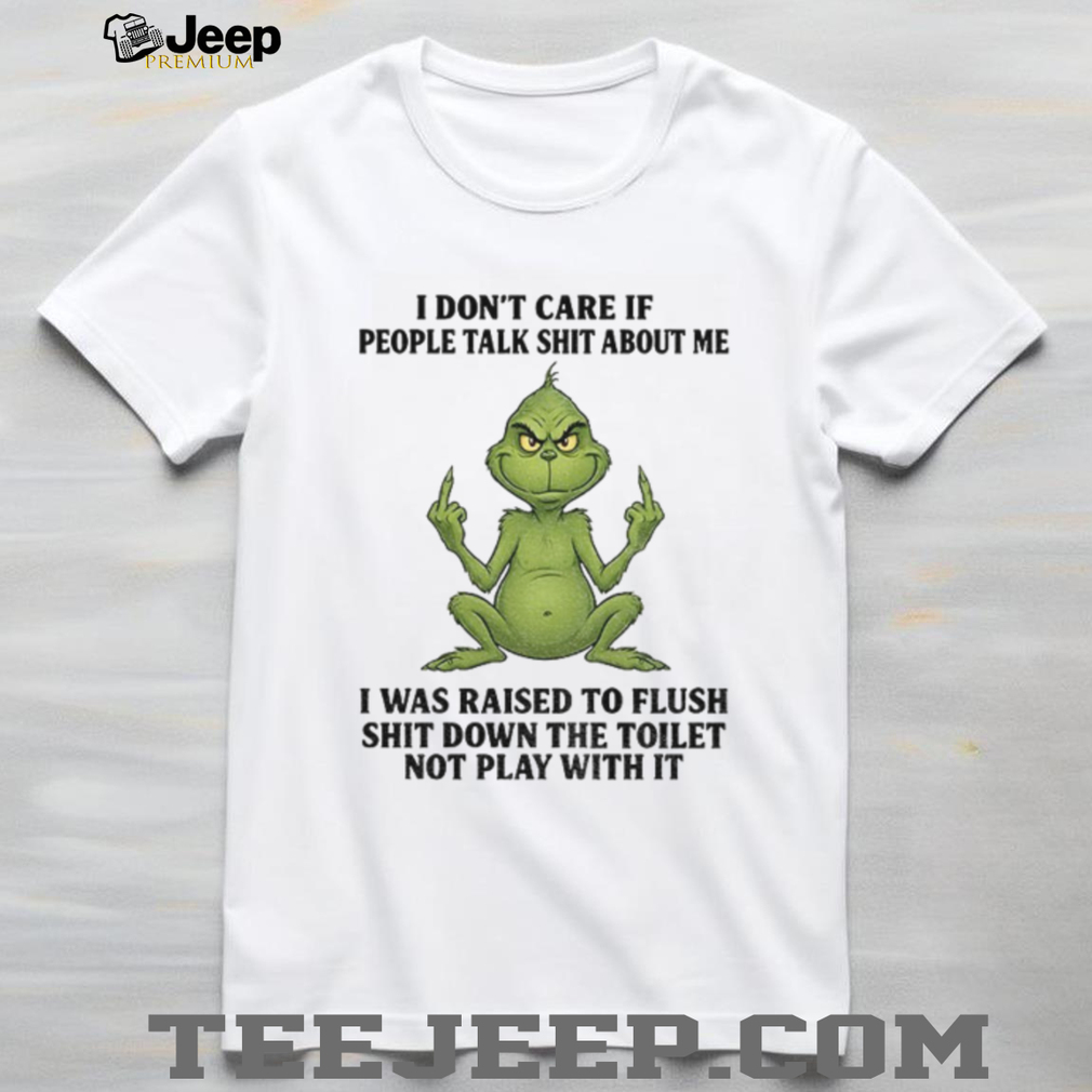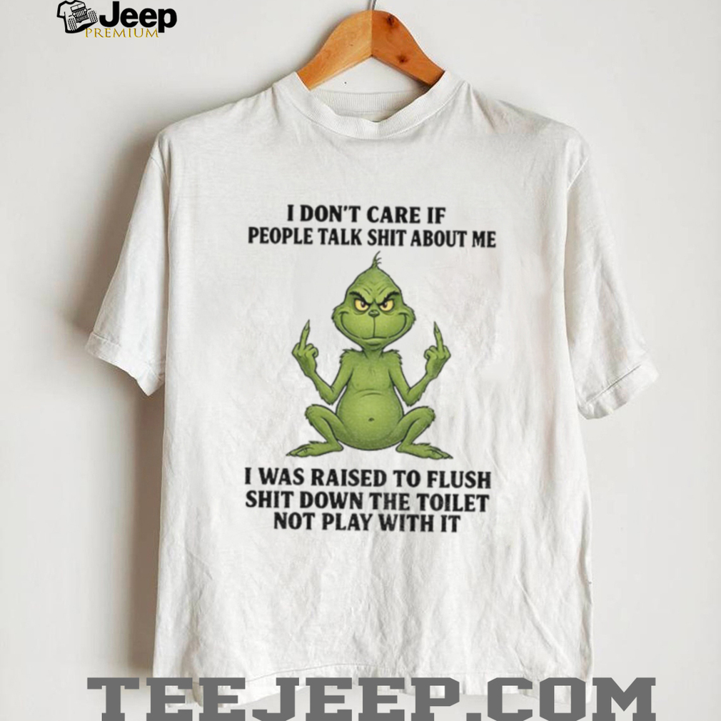 Unleash your inner Grinch with this unapologetically sassy Christmas T-shirt. Featuring the Grinch giving Santa the middle finger, accompanied by the bold statement “I don’t care if people talk shit about me I was raised to flush,” this tee is perfect for those who like to keep it real during the holidays. If you’re tired of overly sweet Christmas cheer and want to make a statement, this shirt is for you. Ideal for edgy holiday parties, casual gatherings, or anyone who wants to add some Grinchy attitude to their wardrobe.