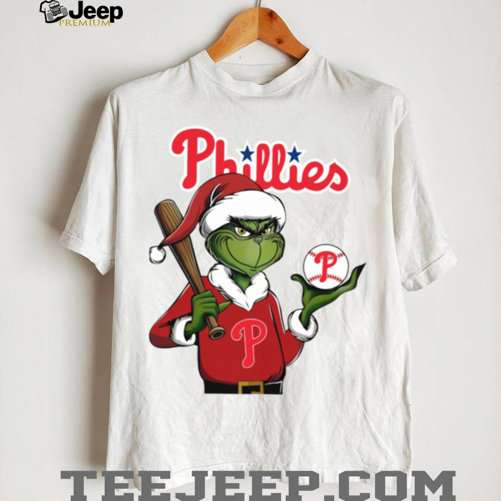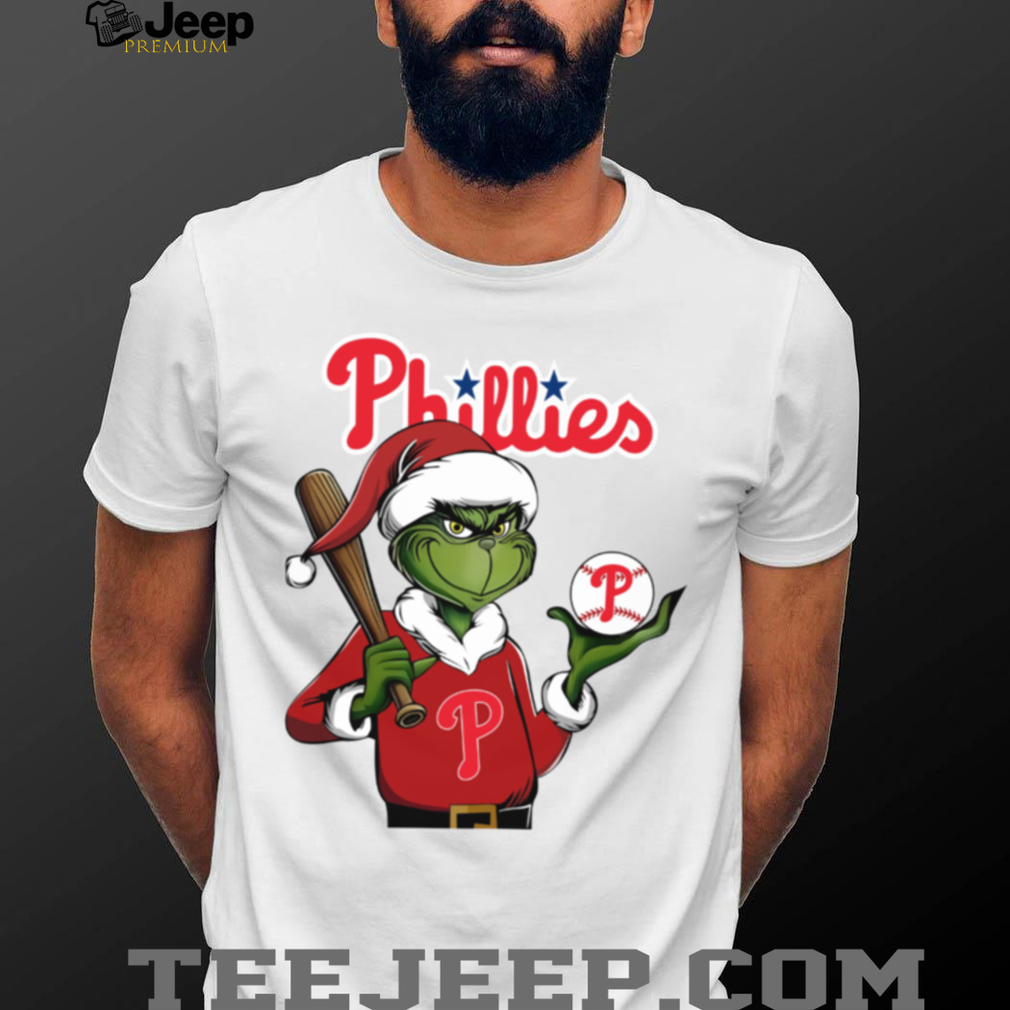 This t-shirt combines the mischievous Grinch and jolly Santa Claus with the Philadelphia Phillies logo in a unique and eye-catching design. It’s a fun and spirited way to celebrate Christmas while repping your team. The comfortable fabric makes it perfect for holiday gatherings or cheering on the Phillies from the stands (even in December, if you’re dedicated!).