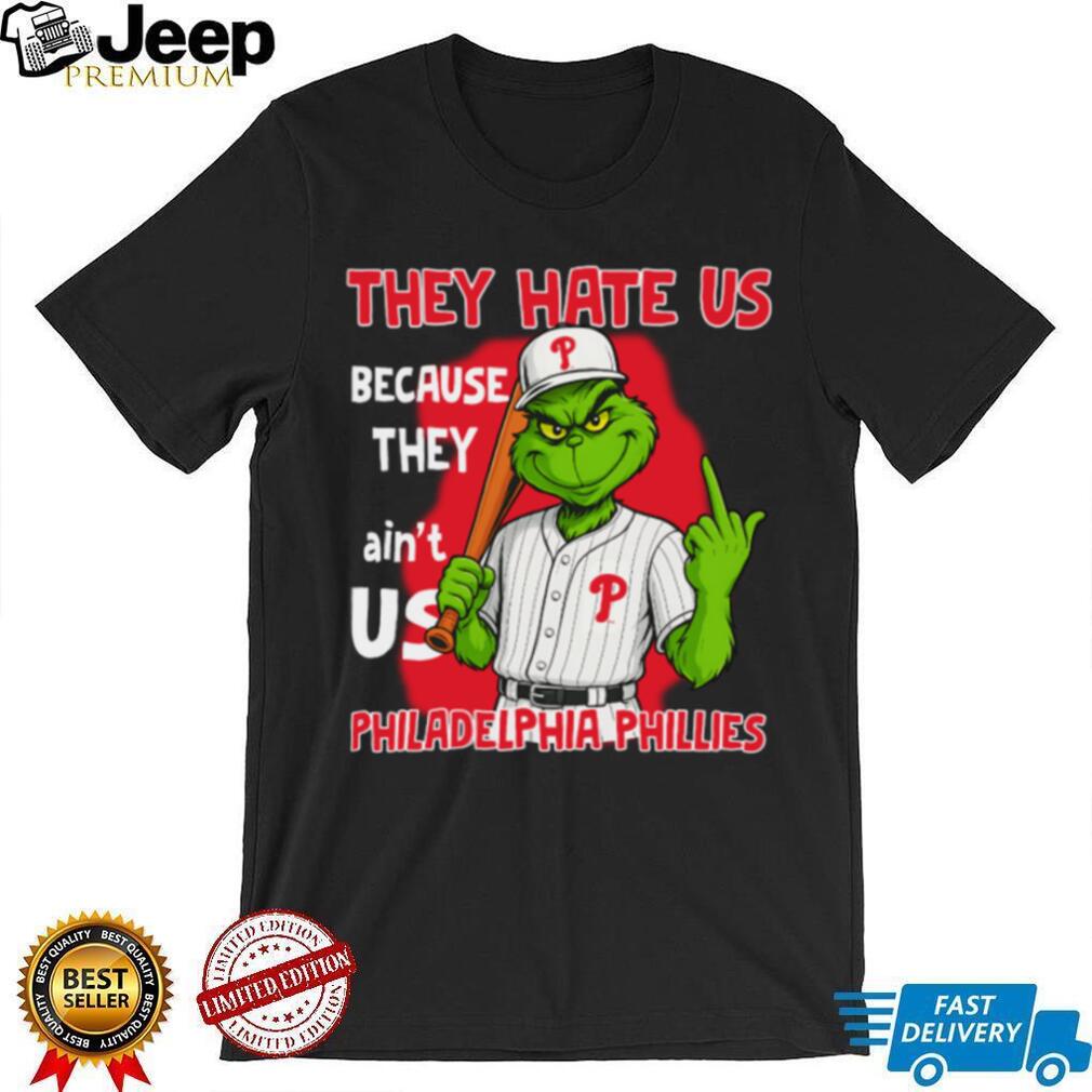Picture this: You’re at Citizens Bank Park, not for a game, but a Christmas event, and you’re turning heads! Sporting this Grinch tee with the iconic Phillies logo and the hilarious saying “They Hate Us Because They Ain’t Us,” you’re the life of the holiday party. This isn’t just a t-shirt; it’s a badge of honor for the most spirited Phillies fanatics who know how to blend team pride with holiday cheer. It’s for those who bleed Phillies red, who love a good laugh, and who know that being a fan is a lifestyle.