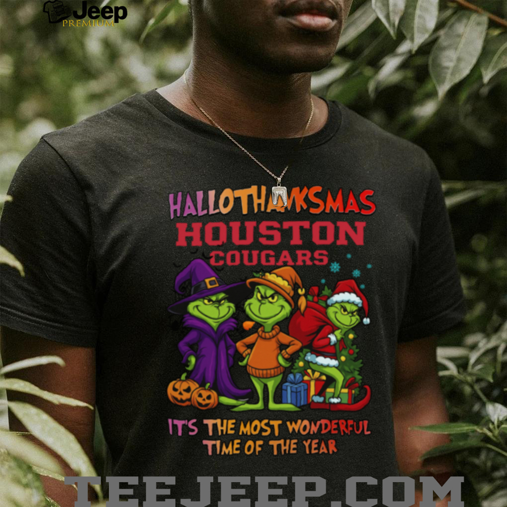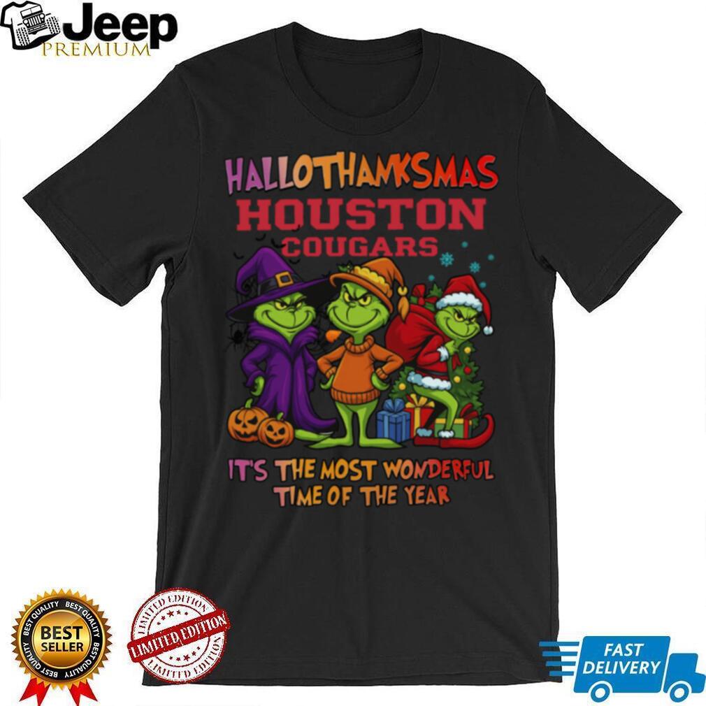 Combine your love for the Houston Cougars and the holiday spirit with this Grinch X Houston Cougars Hallothanksmas T-Shirt! It’s the perfect way to cheer on your team while celebrating Halloween, Thanksgiving, and Christmas all at once. Show off your unique style and spread some Cougar pride this holiday season! If you bleed Cougar red, this shirt is calling your name.