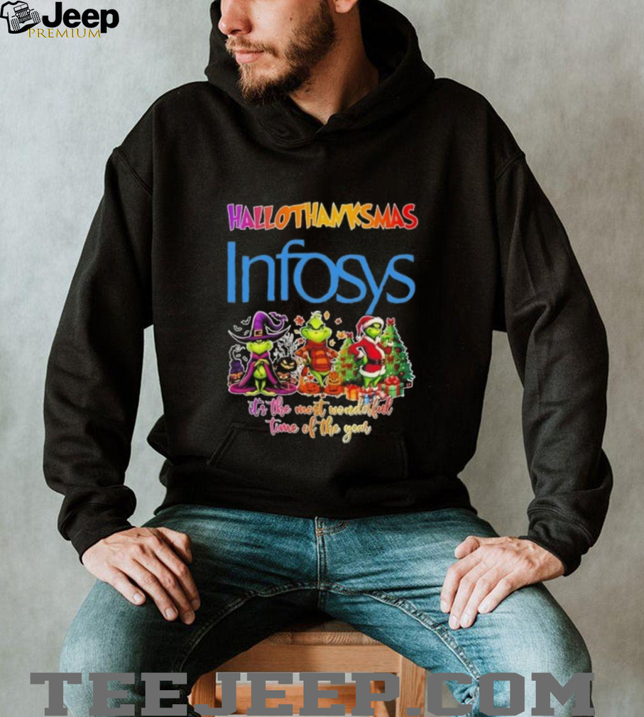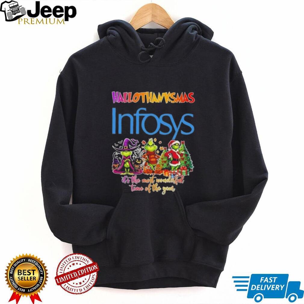 The office holiday party is just around the corner, and you want to make a statement. Forget the ugly sweater; this year, it’s all about the Grinch x Infosys happy HalloThanksMas it’s the most wonderful time of the year shirt. This unique tee is a festive mashup that’s sure to get a laugh and show off your Infosys pride.