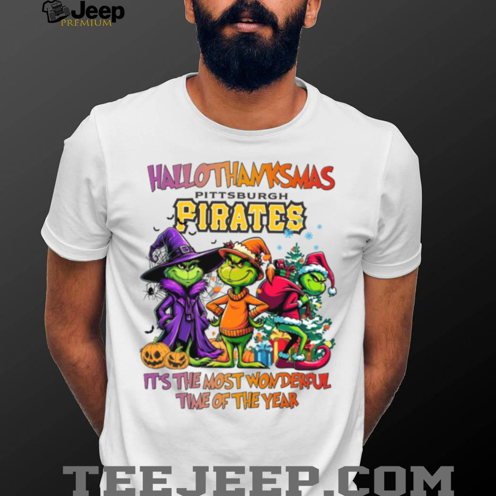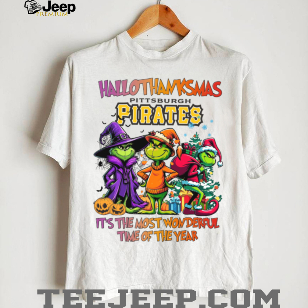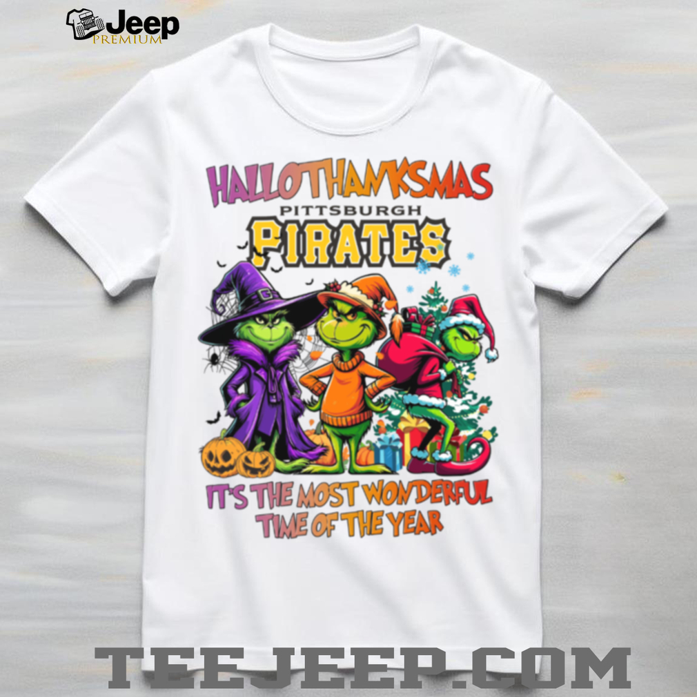 Celebrate Hallothanksmas with a unique twist! This Grinch X Pittsburgh Pirates T-shirt perfectly blends your love for baseball and the holiday season. Get ready to steal the show at your next gathering with this fun and festive tee.