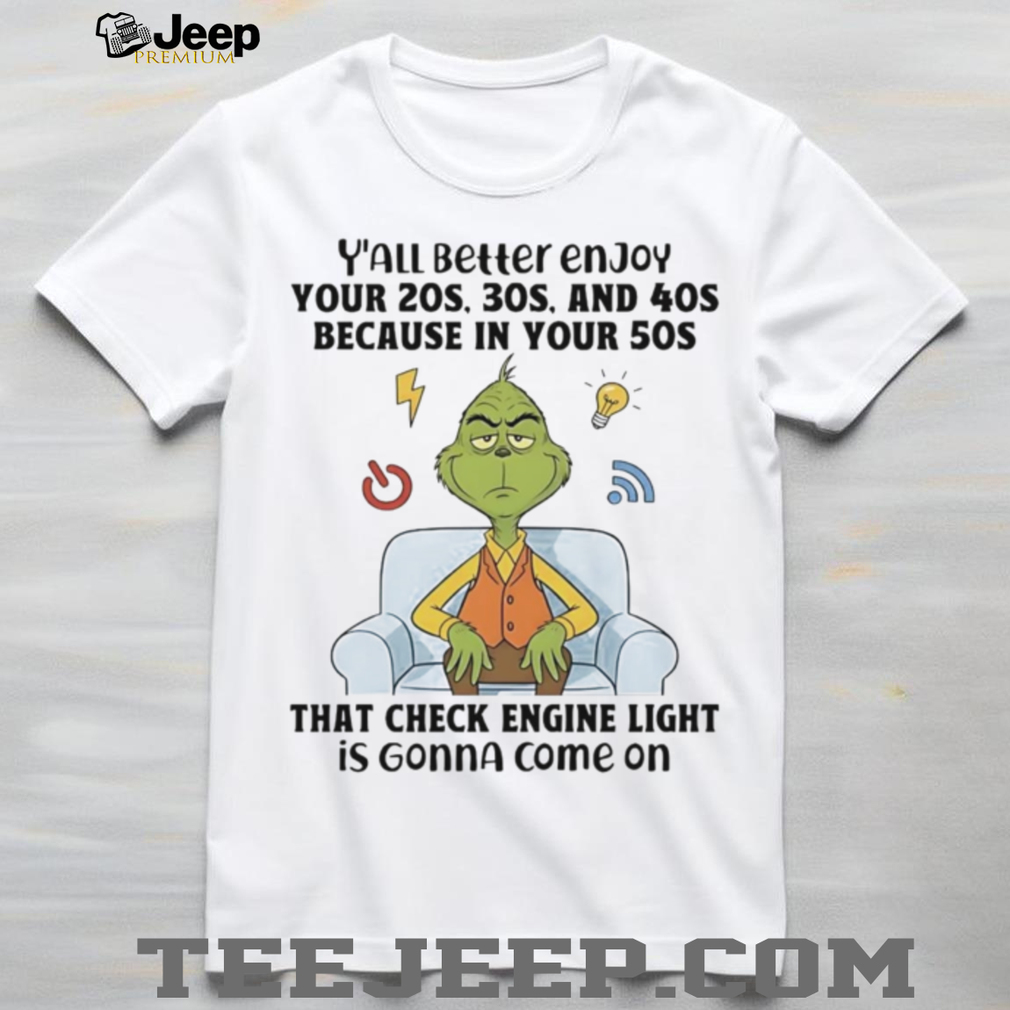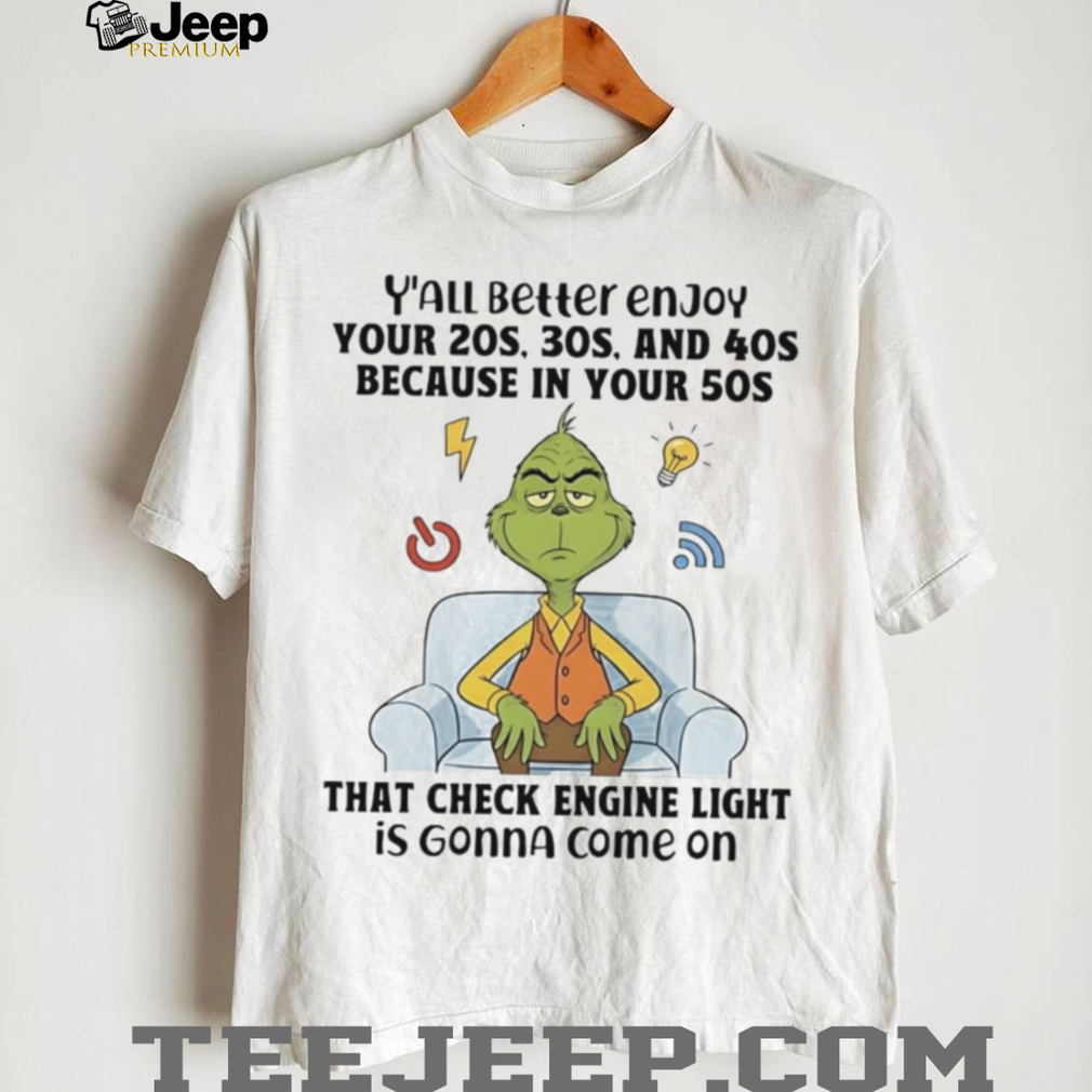 Is your check engine light on, and are your joints starting to creak? Then you’ll relate to this! The Grinch y’all beller enjoy your 20s 30s and 40s check engine light shirt perfectly captures the “joys” of adulthood. This hilarious Christmas-themed tee combines the Grinch’s classic grumpiness with the realities of aging. It’s the ideal way to show off your sense of humor and embrace the chaos of life in your prime (or so you thought!).