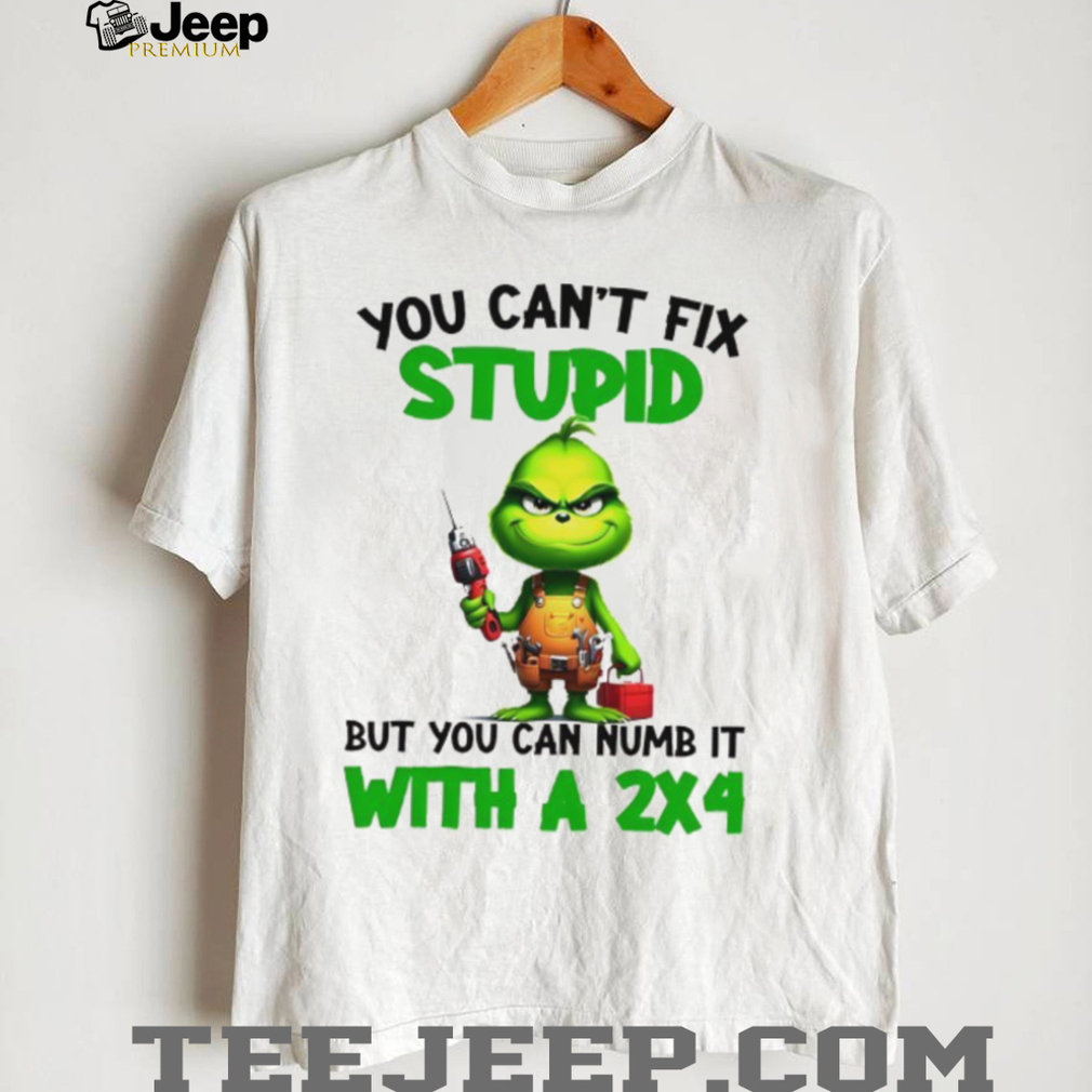 The Grinch you can’t fix stupid but you can numb it with a 2×4 Christmas shirt is perfect for anyone with a dry sense of humor, Grinch enthusiasts, or those who enjoy a bit of playful rebellion during the festive season. It’s ideal for casual holiday parties, Secret Santa exchanges, or simply adding a humorous touch to your everyday winter wardrobe. Give it as a gag gift or wear it yourself to bring some much-needed laughter.