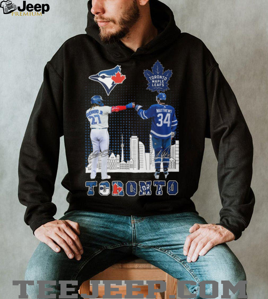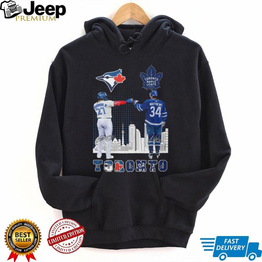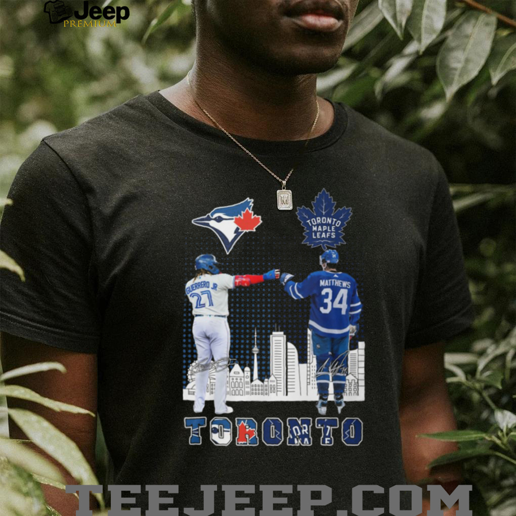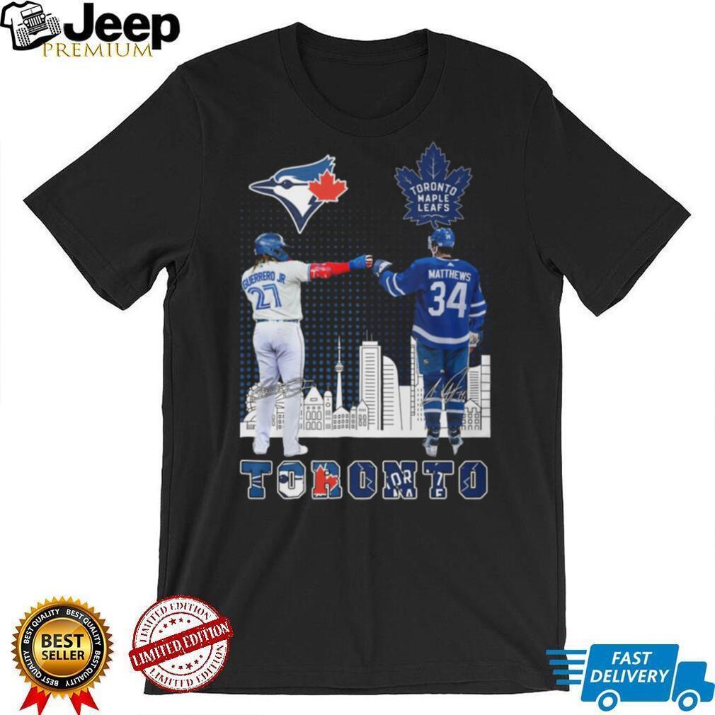 Two Toronto icons — Vladimir Guerrero Jr. and Auston Matthews — share a legendary fist bump in this epic crossover tee for fans of both the Blue Jays and Maple Leafs.