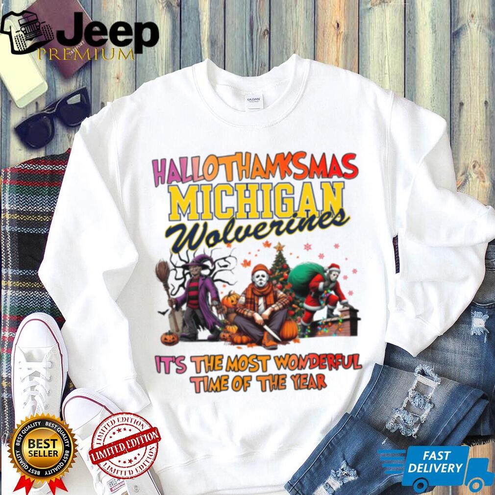 Can’t decide between your love for Halloween, Thanksgiving, Christmas, horror films, and Michigan Wolverines football? This “Halloween Thanksgiving Christmas Shirt” is a mashup of all your favorite things! It’s the perfect way to showcase your diverse interests in one unique design. Get ready to stand out from the crowd with this quirky Hallothanksmas tee.