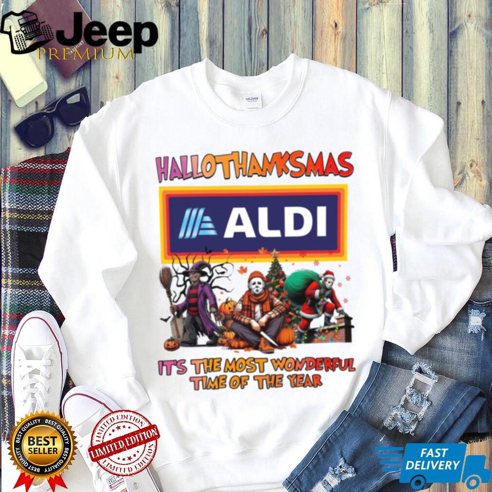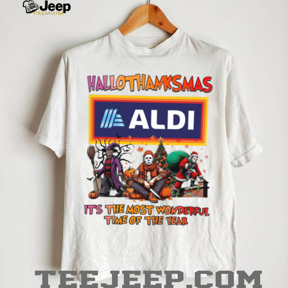 Combine your love for spooky season and holiday cheer with this hilarious Horror Movies Aldi Hallothanksmas T-Shirt! This tee perfectly blends the thrills of horror films with the joy of Halloween, Thanksgiving, and Christmas, all while giving a nod to everyone’s favorite discount grocery store, Aldi. It’s the perfect shirt for those who love a good laugh and festive fun.
