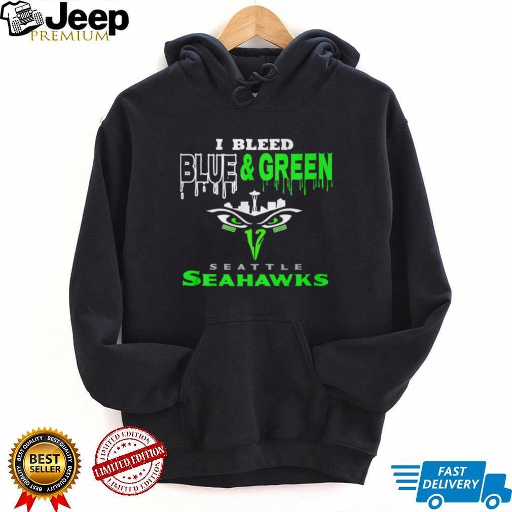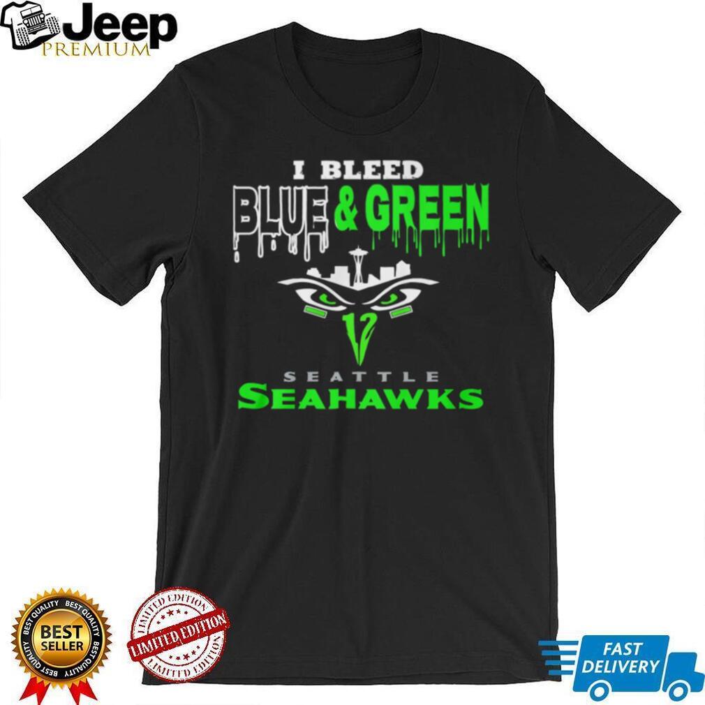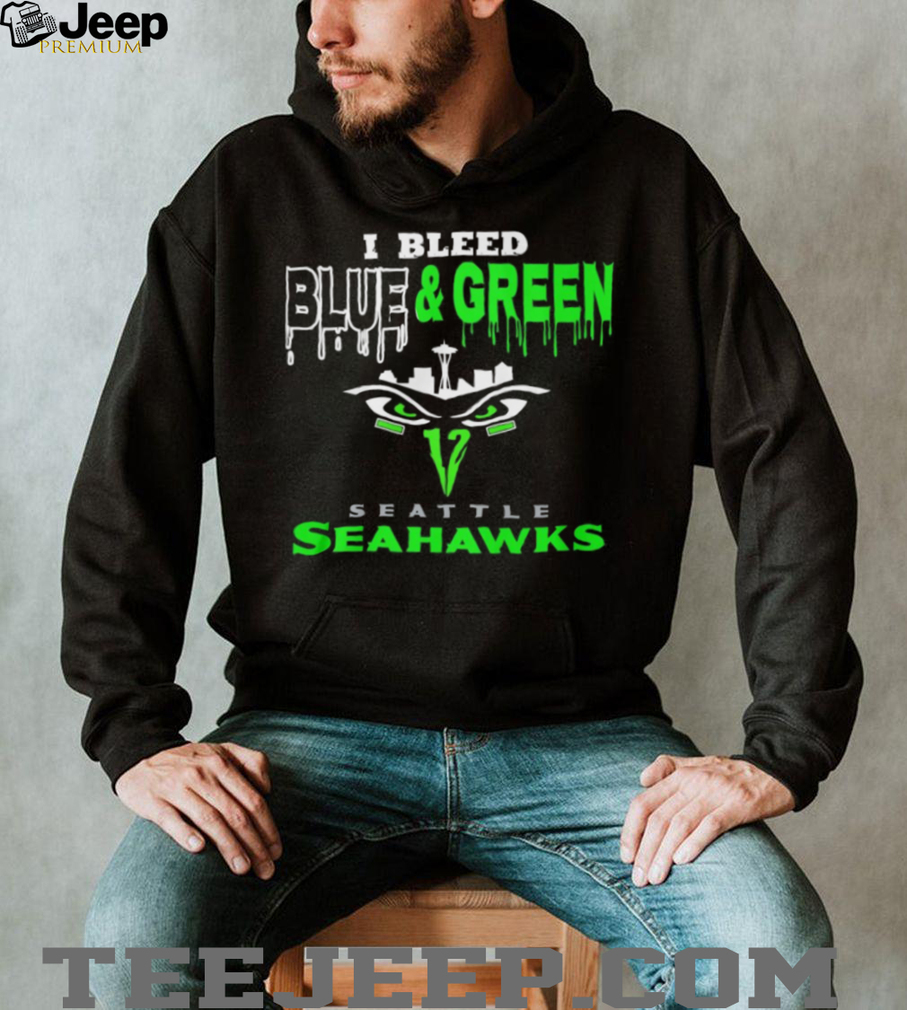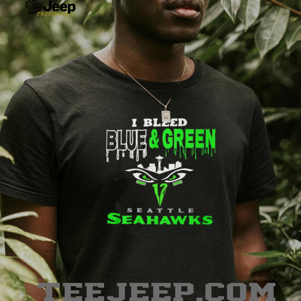 👕 About I Bleed Blue and Green Seattle Seahawks Skyline Drip Graphic Tee