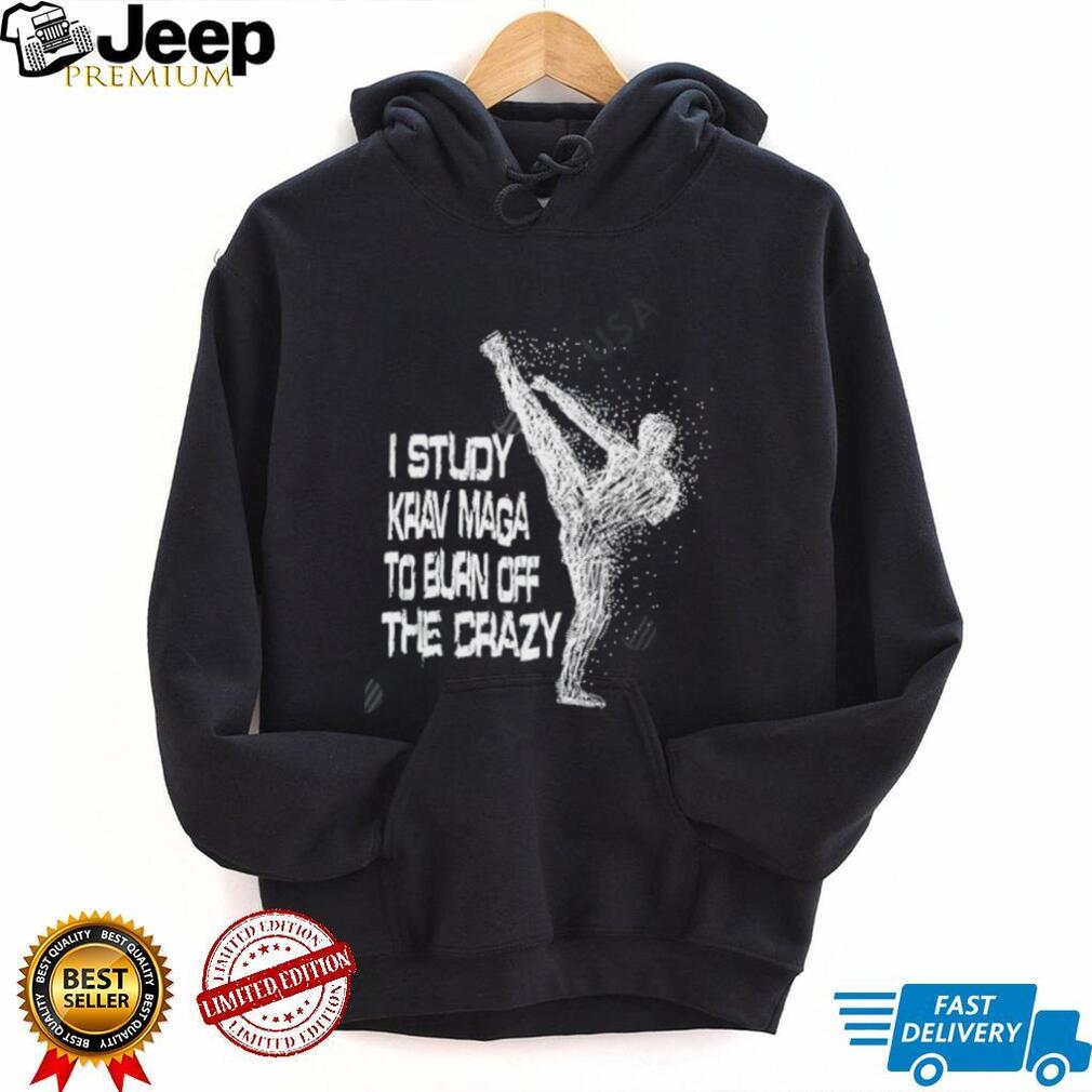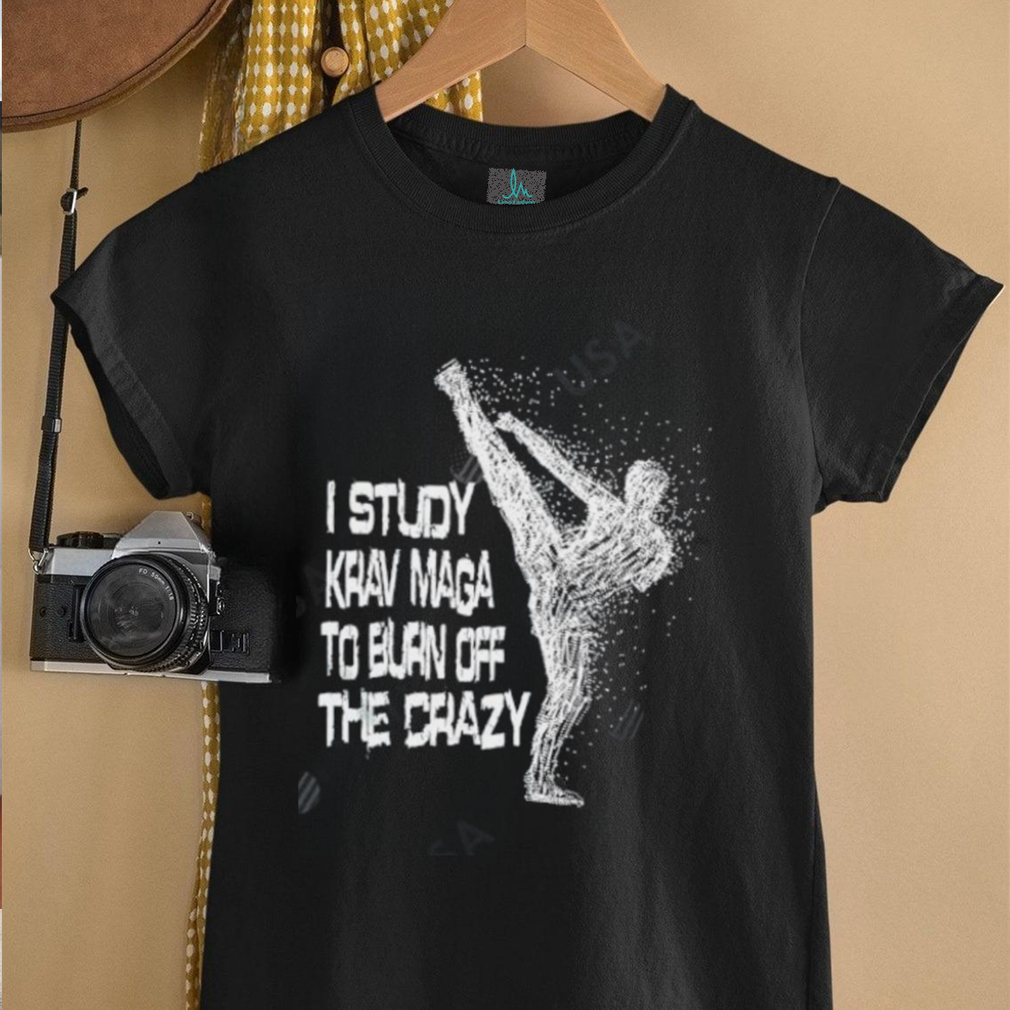 The “I Study Krav Maga To Burn Off The Crazy shirt” is a piece of apparel that humorously connects the practice of Krav Maga, a self-defense system, with the release of pent-up stress or “crazy.” This shirt serves as a lighthearted way for individuals to express their passion for Krav Maga while also acknowledging the mental and emotional benefits of the training. It’s designed to resonate with those who find Krav Maga to be an effective outlet for stress relief and who appreciate a bit of humor in their workout routine. The design would prominently feature the phrase “I Study Krav Maga To Burn Off The Crazy,” often in a bold or playful font, and potentially incorporate imagery related to Krav Maga, such as fighting stances, martial arts symbols, or silhouettes of practitioners. It’s a way to visually represent the connection between self-defense training and stress release.