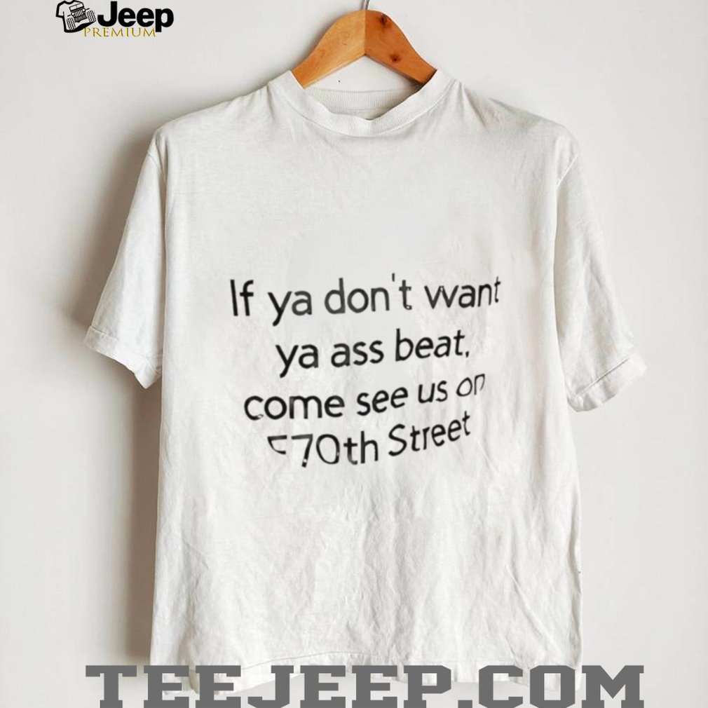 In conclusion, the “If ya don’t want ya ass beat come see us on E70th street shirt” delivers a clear threat of violence linked to a specific location, most likely intended to assert dominance or warn others. While a humorous interpretation is possible in very specific contexts, the primary message is aggressive and carries potential negative social and legal implications.