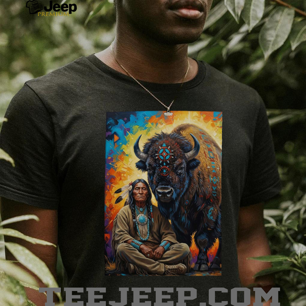 (Indigenous Spirit Wisdom Sitting Warrior & Buffalo T shirt)Indigenous Spirit Wisdom Sitting Warrior & Buffalo T shirt, Treat yourself or make a great gift for your loved ones