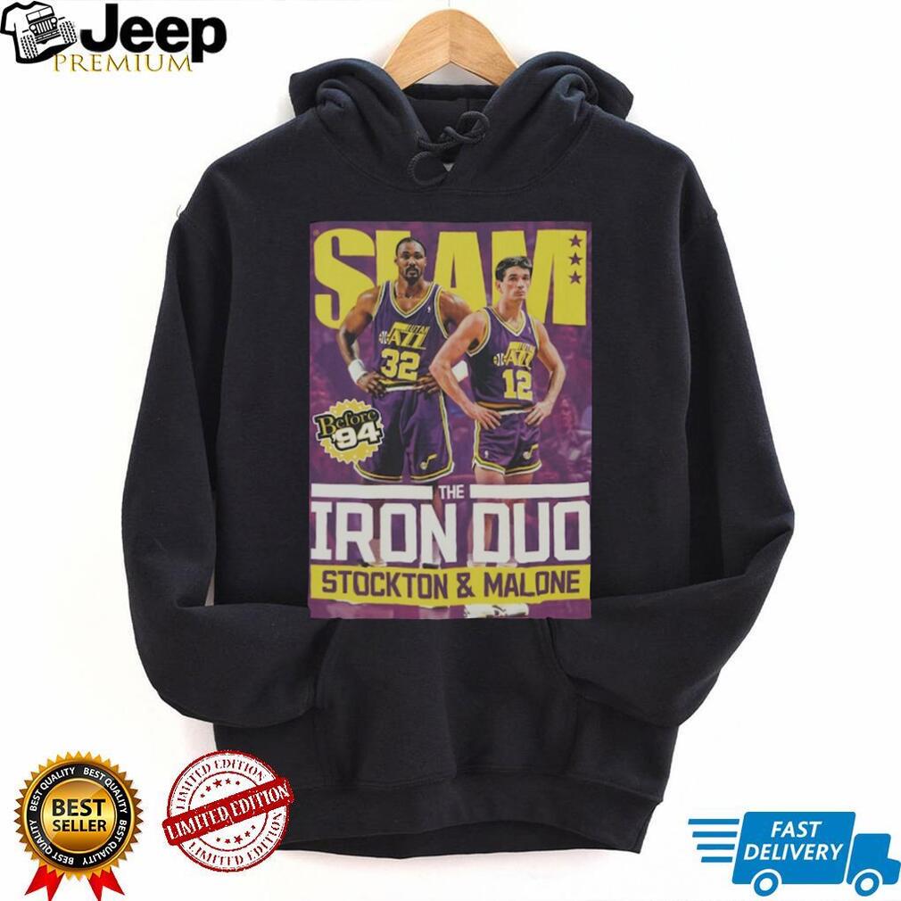 Celebrate the legacy of Stockton and Malone with this classic Utah Jazz tee! This “Slam Iron Duo” shirt pays tribute to the legendary duo. A must-have for any true Jazz fan.