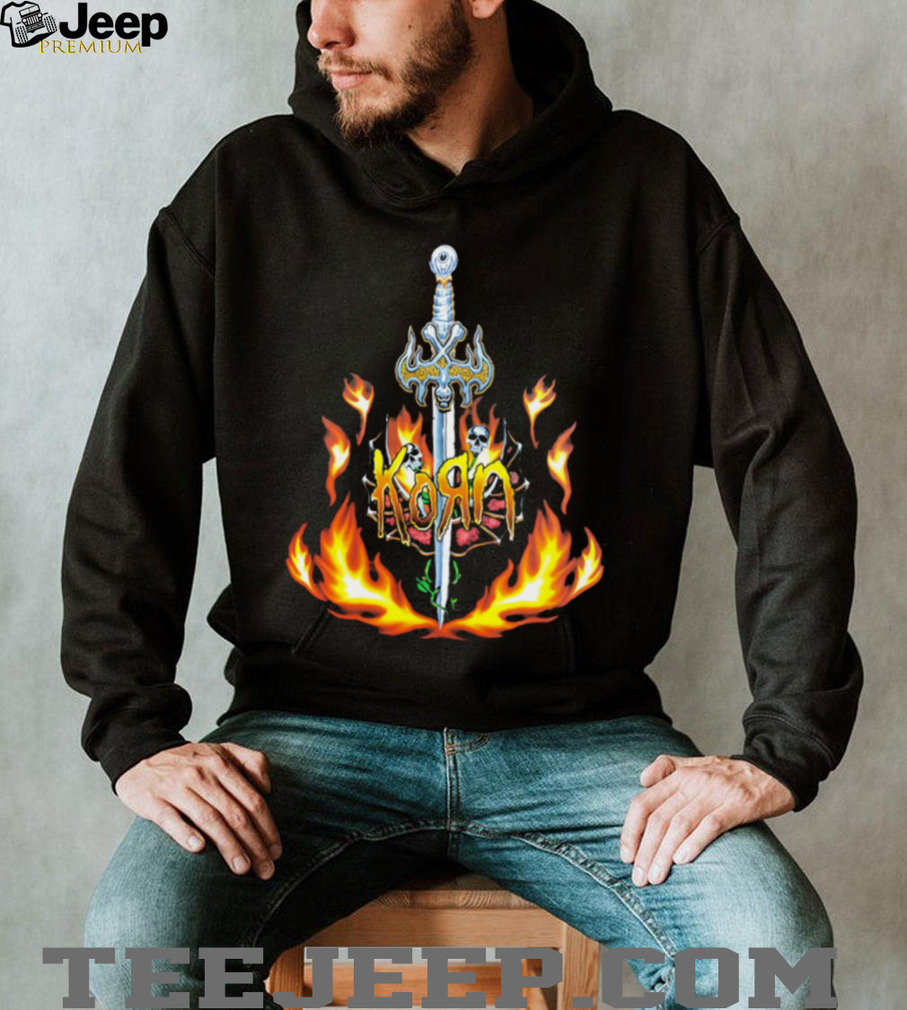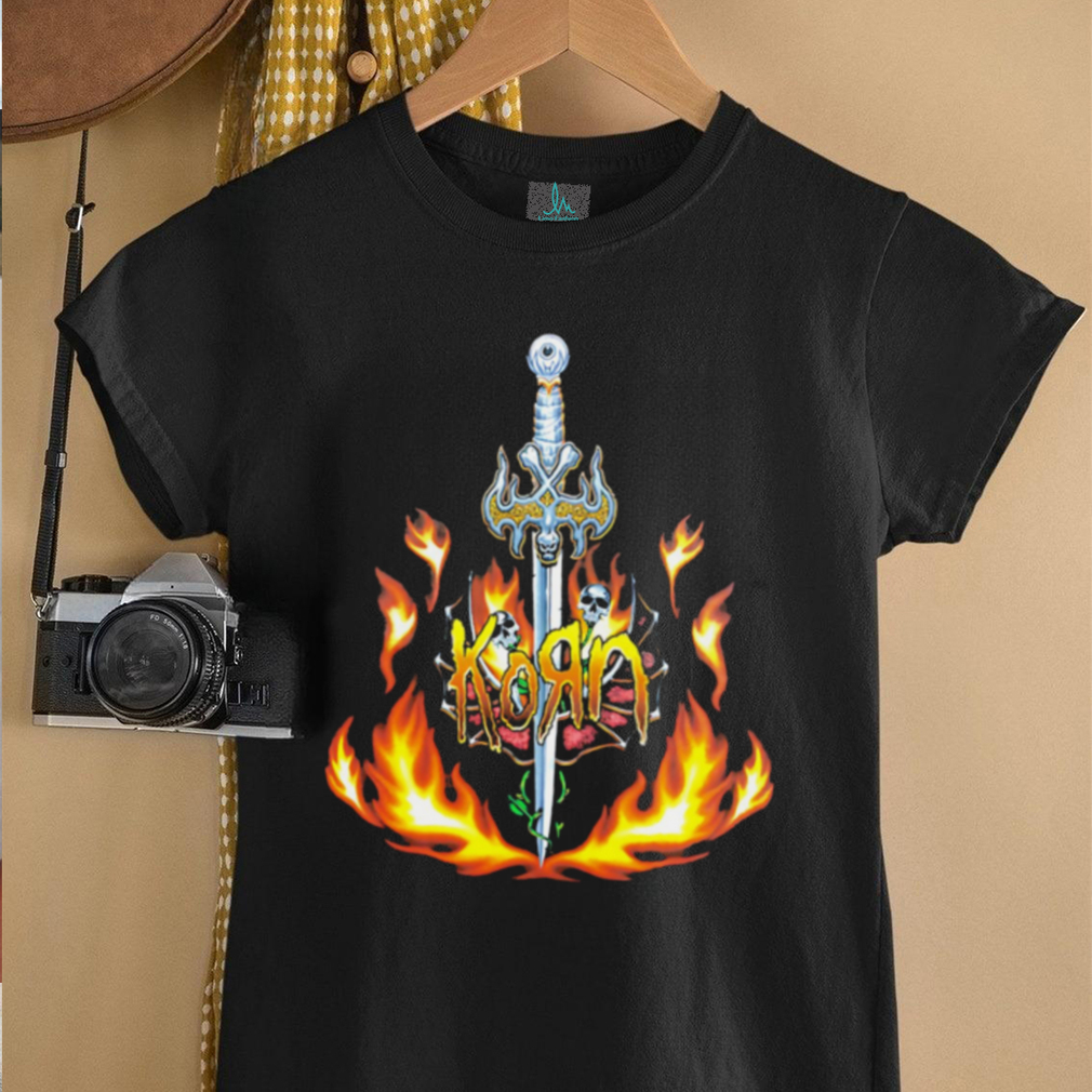 The imagery of a sword and fire, when associated with a band like Korn, can also represent the enduring intensity and impact of their music. Korn is considered a pioneering force in the nu-metal genre, known for their heavy riffs, emotionally raw vocals, and often chaotic soundscapes. A shirt featuring these potent symbols can serve as a visual reminder of the band’s powerful presence in the music world and their lasting influence on subsequent generations of artists and fans who connect with their intense and often cathartic musical expression.