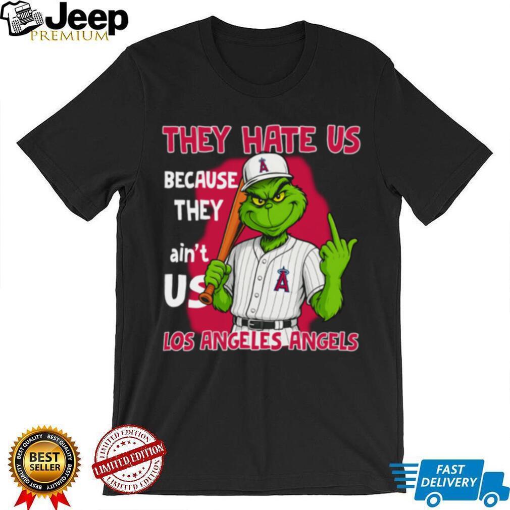 Picture this: It’s Christmas time in Anaheim, and you’re rocking the ultimate Angels-themed holiday gear. This tee features the Grinch, sporting Angels colors, with a message that’s sure to get a laugh: “They Hate Us Because They Ain’t Us.” This isn’t just a shirt; it’s a badge of honor for the most spirited Angels fans. It’s for those who bleed halo red, those who love a good Christmas chuckle, and those who know that true fandom means embracing both the highs and the hilarious lows.