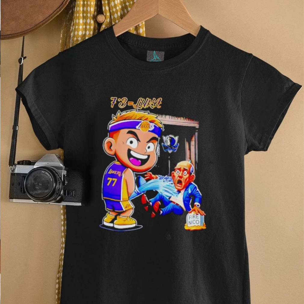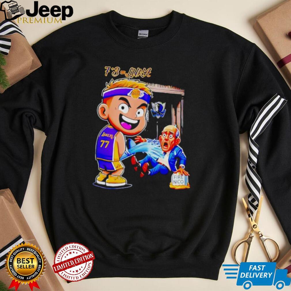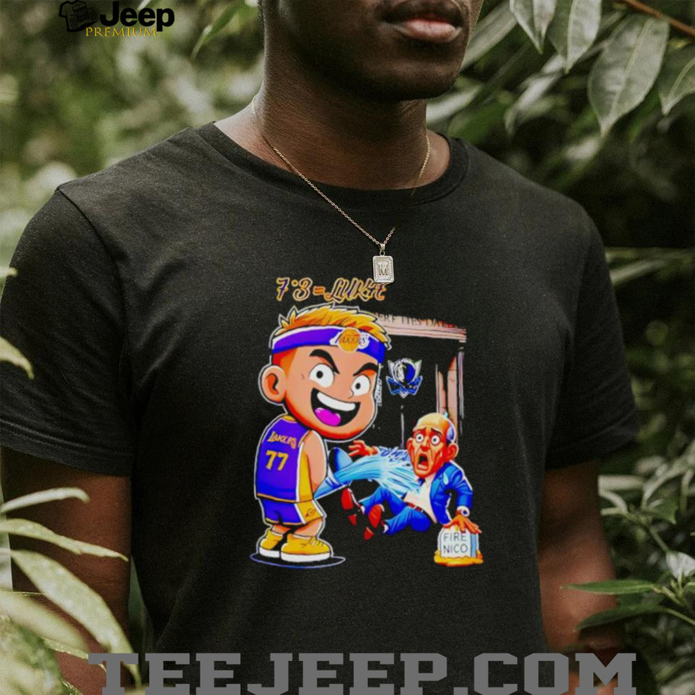 Witness the artistic interpretation of Luka Dončić’s on-court intensity with the “Luka Kicked Dallas Fire Nico Funny Cartoon” shirt! Forget the serious game face for a moment and imagine a cartoon Luka, leg comically extended, sending a trail of Dallas Mavericks blue fire towards a bewildered (but probably still smiling) Nico Harrison. Maybe Nico’s even got a little cartoon sweatdrop or a slightly singed tie. This isn’t your typical basketball tee; it’s a dose of pure, unadulterated humor that captures the passion (and maybe a little bit of playful frustration) of being a Mavs fan. Sport this and get ready for chuckles and knowing nods from fellow hoops aficionados who appreciate a good laugh!