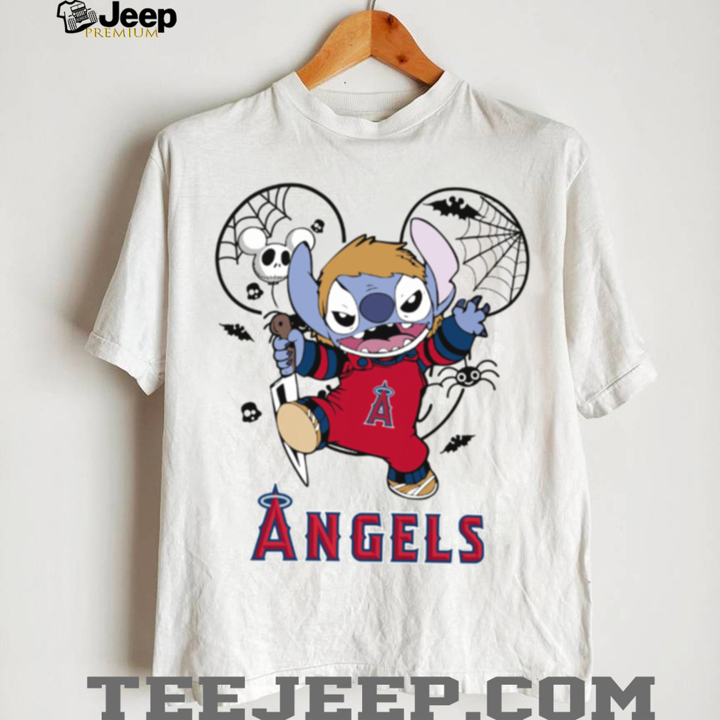Show your Angels pride this Halloween with a spooky twist! This Los Angeles Angels Halloween shirt features Stitch dressed as Michael Myers, ready to hit a home run for your favorite team. Imagine turning heads at the ballpark or Halloween party with this unique and eye-catching design. This isn’t just a shirt; it’s a statement that you’re a die-hard Angels fan with a wicked sense of humor.