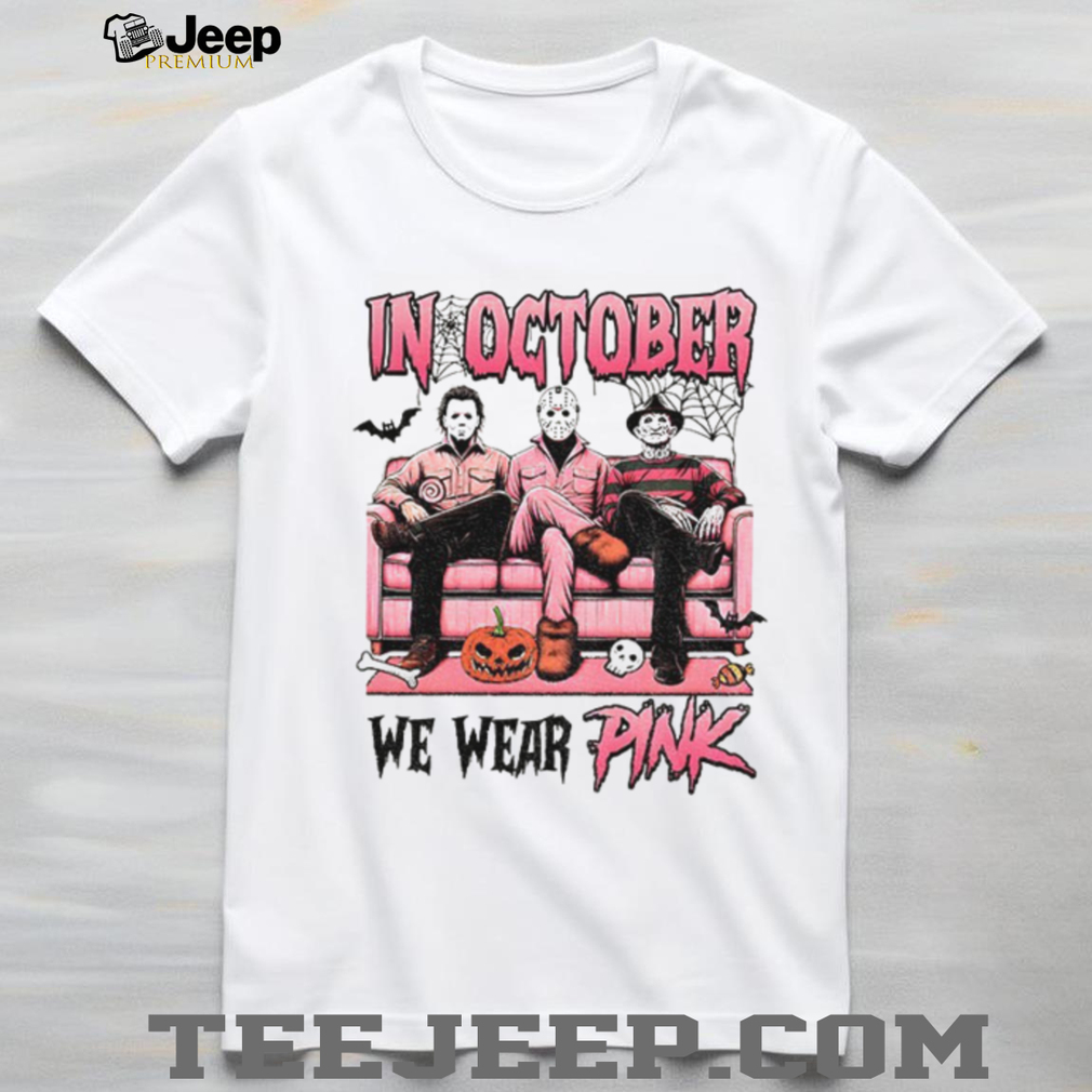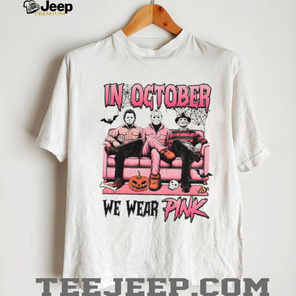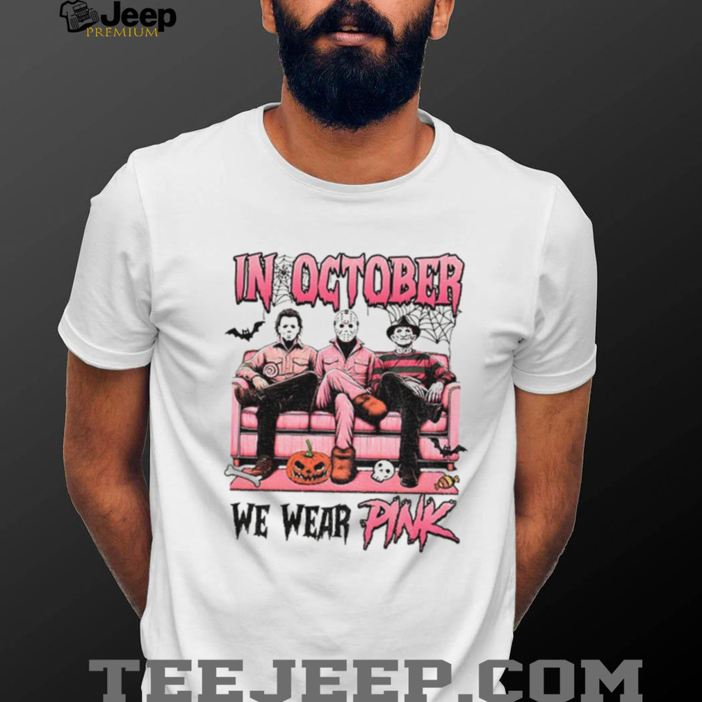 This “Michael Myers Jason Voorhees Freddy Krueger spooky season in October we wear pink Halloween shirt” combines horror icons. Made from a soft and comfortable cotton blend, perfect for all-night horror movie marathons or trick-or-treating. It also shows that you care about an important cause.