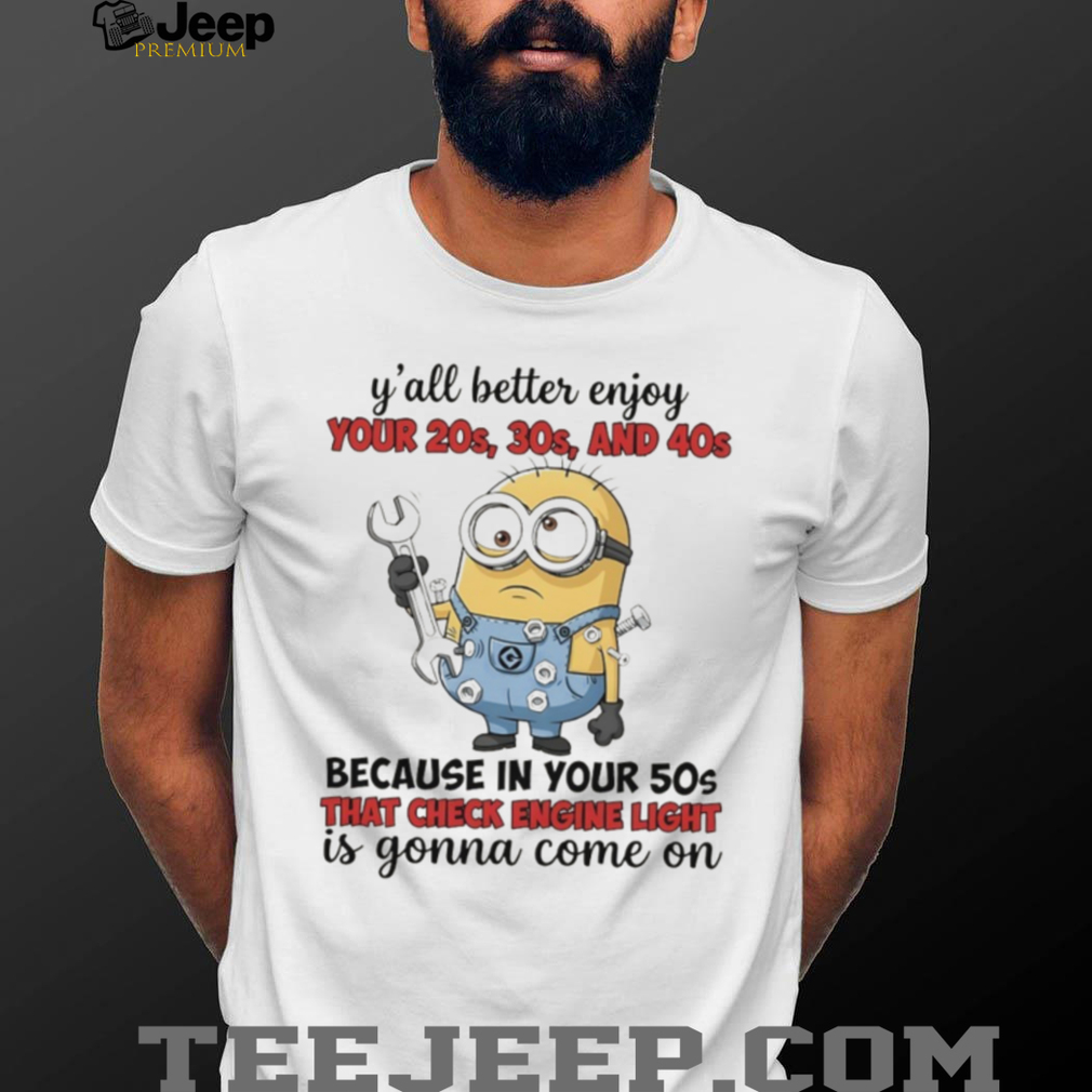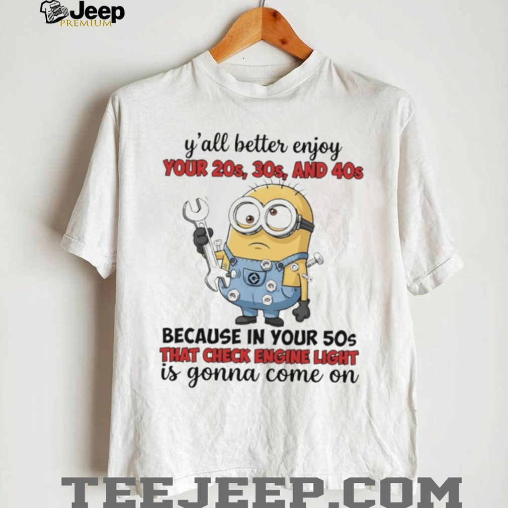 A Minion in mechanic overalls can’t figure out why the ‘check engine’ light is on — just like the rest of us. This funny aging humor tee hits close to home.
