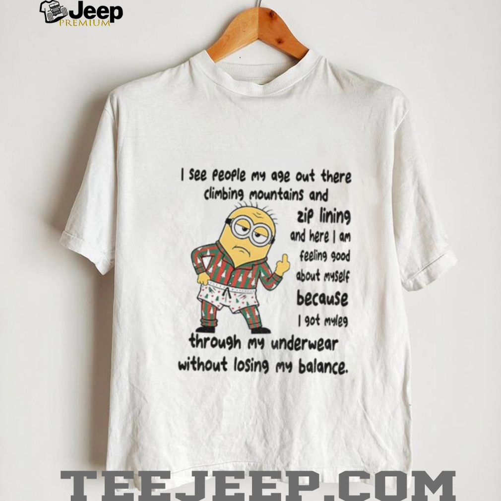 This Minion middle finger shirt stands out with its witty graphic and even wittier text. Featuring a beloved Minion expressing a very relatable sentiment with a subtle middle finger gesture, it’s designed to bring a smile to faces and spark conversations. The phrase, ‘I see people my age out there climbing mountains and zip lining and here I am feeling shirt,’ is a hilarious take on the challenges of aging. Made from a soft, breathable cotton blend, this tee ensures comfort whether you’re actually out doing things or just enjoying some well-deserved relaxation. The durable print means this funny message will last as long as your relatable struggles. It comes in various sizes to offer a comfortable and flattering fit for all who appreciate a good laugh.