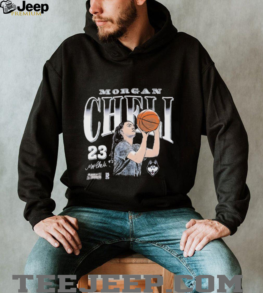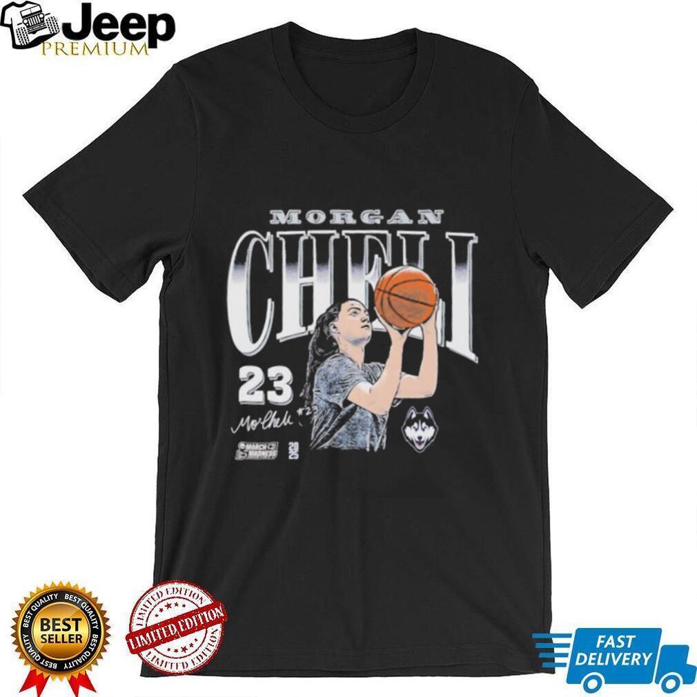 The design of the t-shirt typically incorporates a cartoon-style illustration of Morgan Cheli, potentially in action or with a playful expression. It might also include elements related to UConn basketball, such as the team’s logo, colors, or basketball-themed graphics. The design aims to capture the player’s likeness while adding a touch of whimsy and personality. The quality of the print and the fabric are essential, as this t-shirt is intended to be worn at games, fan gatherings, and casual outings. It acts as a visual representation of the wearer’s support for Morgan Cheli and the UConn Huskies.