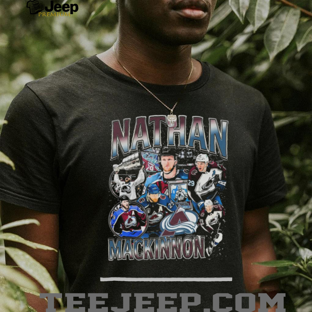 ()To me, what’s important is comfort/less pain (knee arthrosis). The only effort I’m willing to make is a half-hearted attempt to purchase shoes that fulfil both of our conditions, and don’t break the bank. That effort is currently ongoing but the task is not yet done, which means his efforts to keep my feet dry, and mine to be more comfortable, continue to Nathan MacKinnon NHL Player Distressed T Shirt in the rainy fall weather we’ve been having. The other ongoing argument we have also has to do with weather and clothing, in that he runs cold and I run hot. So while he’s bundled up in thick socks, warm boots, thermal underwear, heavy trousers, a t-shirt, sweater, heavy coat, warm hat, scarf, and gloves, I’m wearing light trousers, a t-shirt and a light jacket. A neighbor has commented that while walking together, we look like we’re coming from, or going to, entirely different places. My hands are still often warmer than his. Yes, I know, cold hands warm heart! So anyway, I can’t trust his evaluation of the weather, and he can’t trust mine. We both try to make allowances but it’s hard to judge for someone who’s so different than yourself. He’s trying to stay warm, and I’m trying to not sweat too much (sorry, TMI). To sum up, I’m fortunate that he doesn’t really care that I make little effort with my appearance, and he’s willing to take up Nathan MacKinnon NHL Player Distressed T Shirt slack.
