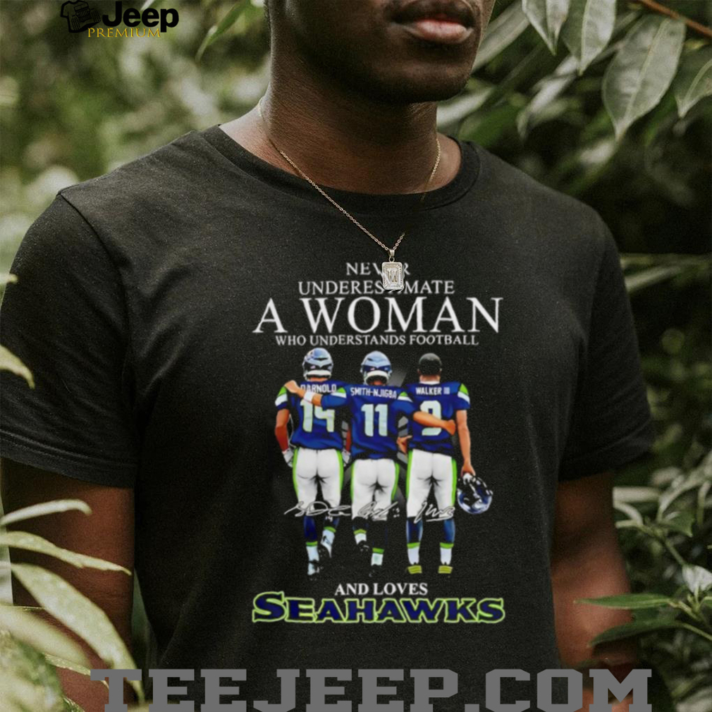 (Never Underestimate A Woman Who Loves Seahawks Football T Shirt)With the regular season over for non-playoff teams, the debate over the No. 1 overall pick in the 2026 NFL Draft has reached a fever pitch. The Las Vegas Raiders hold the top selection and are reportedly agonizing between Indiana’s Fernando Mendoza and Oregon’s Dante Moore. Scouts at the recent Peach Bowl were spotted in the stands wearing nondescript Never Underestimate A Woman Who Loves Seahawks Football T Shirt while meticulously charting Mendoza’s elite 72% completion rate and Moore’s staggering 78% mark. Mendoza is currently the Never Underestimate A Woman Who Loves Seahawks Football T Shirt due to his pro-ready processing and 14–0 record, but Moore’s “C.J. Stroud-like” arm talent offers a higher ceiling that may be too tempting to pass up. Their upcoming head-to-head clash in the College Football Playoff semifinal is expected to be the final deciding factor for NFL front offices.
