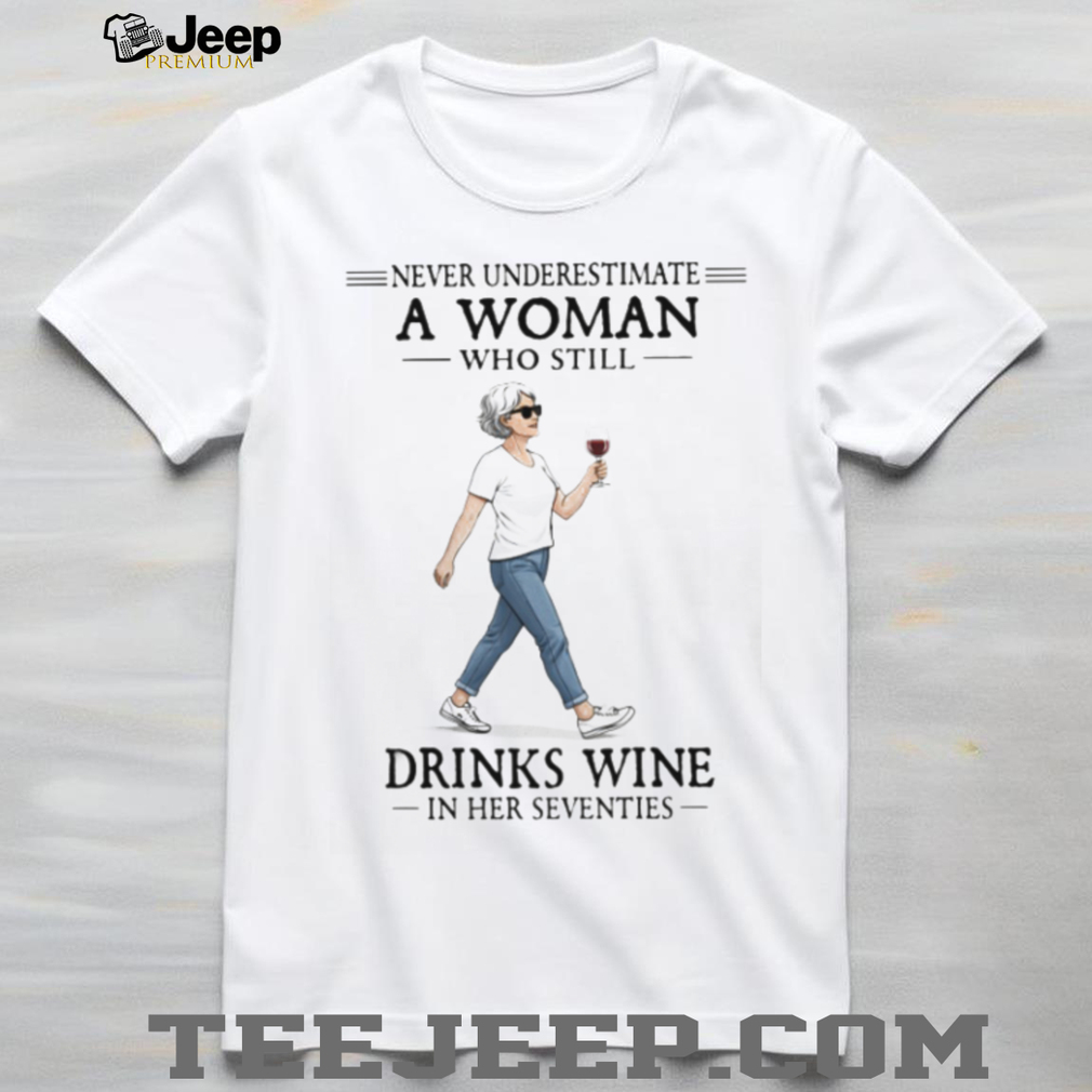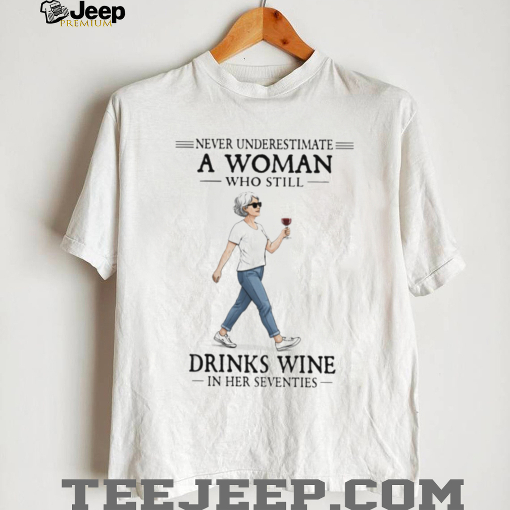👕 About Never Underestimate A Woman Who Still Drinks Wine In Her Seventies Walking T Shirt