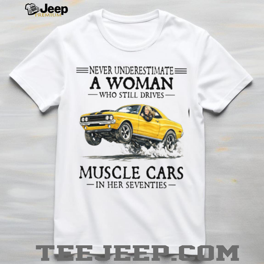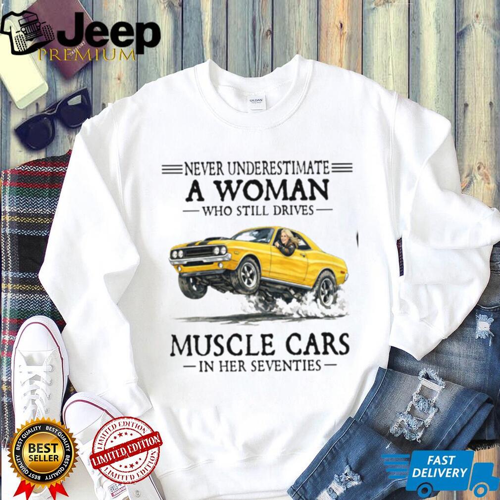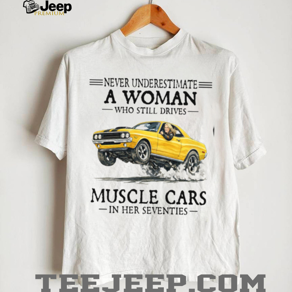 👕 About Never Underestimate A Woman Who Still Drives Muscle Cars In Her Seventies T Shirt