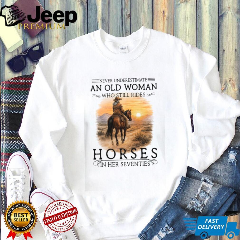 (Never Underestimate An Old Woman Who Still Rides Horses Sunset T Shirt)Never Underestimate An Old Woman Who Still Rides Horses Sunset T Shirt
