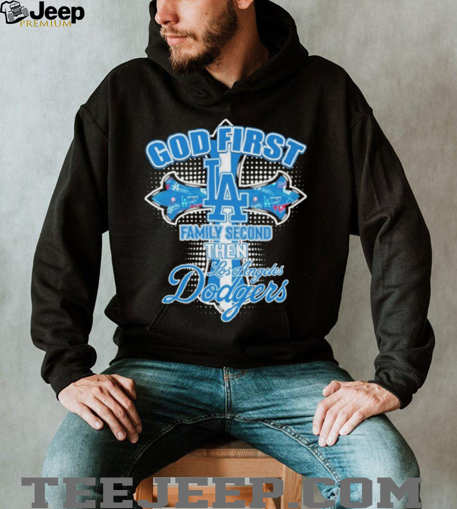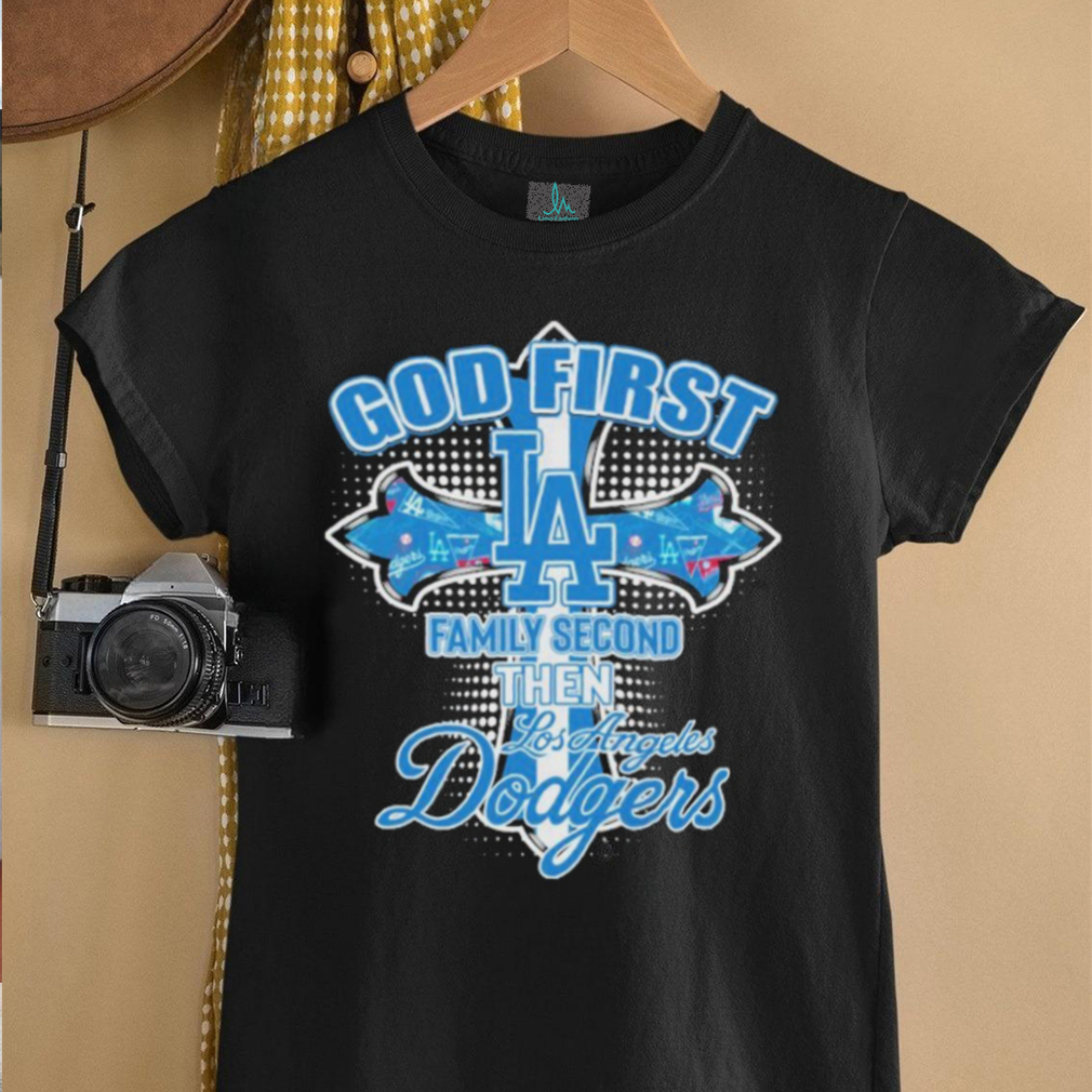 Sporting this t-shirt is a way for fans to visibly communicate their core values and their passion for the Los Angeles Dodgers. By explicitly stating “God First, Family Second,” the wearer emphasizes the foundational role of faith and family in their life, with their love for the baseball team following in significance. This resonates with individuals who integrate their religious beliefs and familial bonds into their identity as sports fans. The shirt becomes a wearable representation of their personal hierarchy of values, showcasing that while they are enthusiastic supporters of the Dodgers, their faith and family hold a higher priority in their lives.