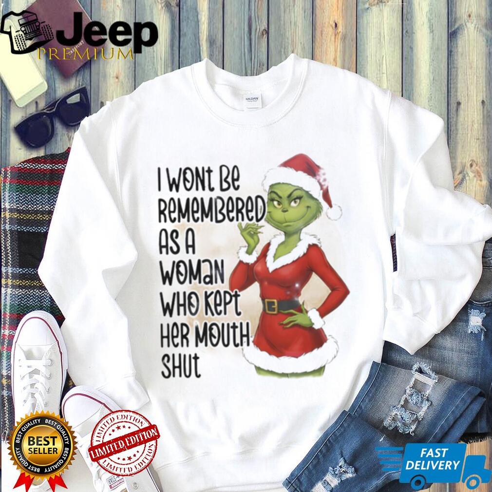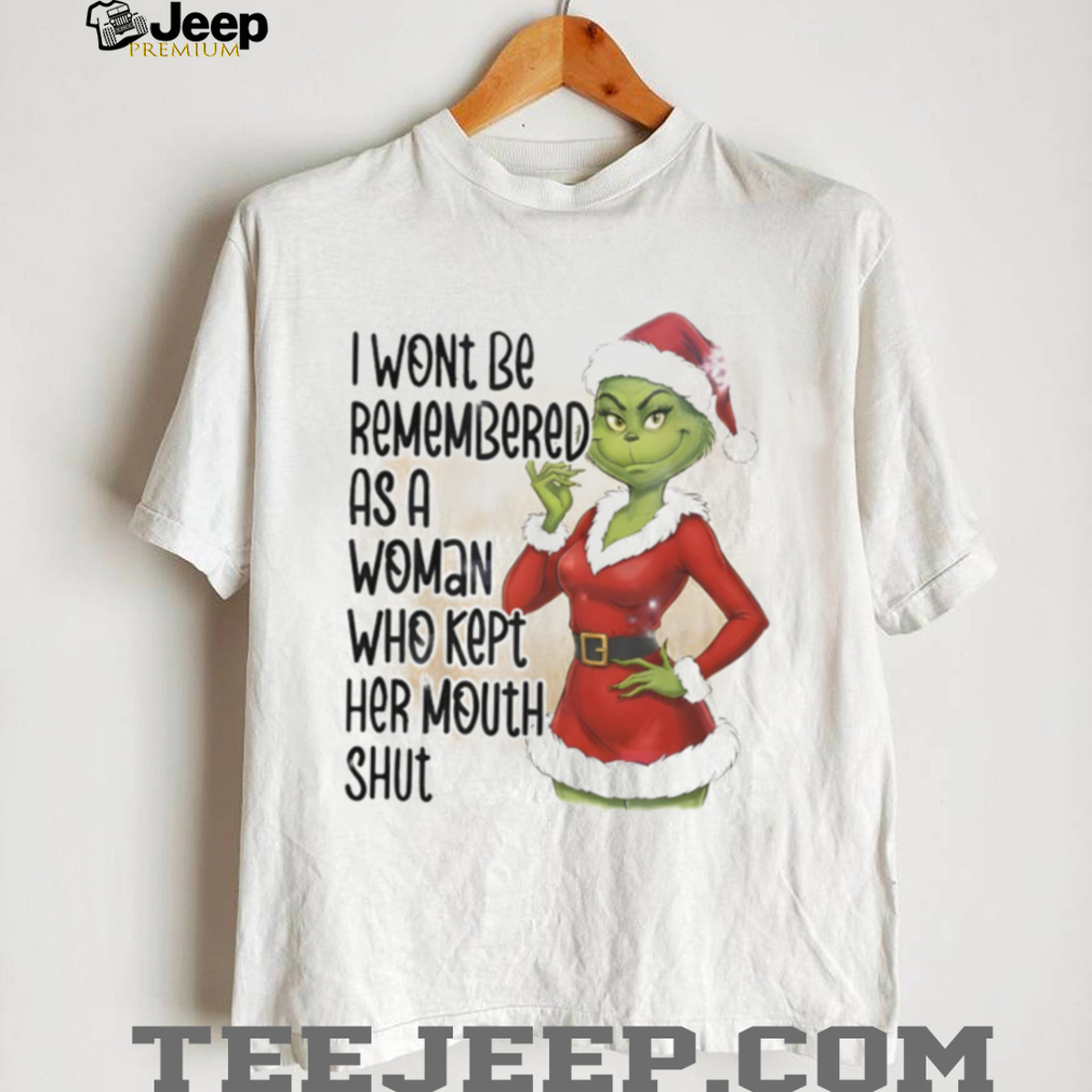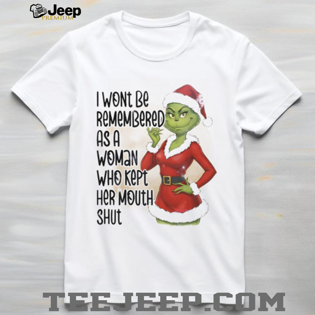 Show your unwavering loyalty with the “Official Grinch Santa I Won’t Be Remembered As A Woman Who Kept Her Mouth Shut Christmas Shirt.” This festive tee combines holiday cheer with a bold statement, perfect for those who aren’t afraid to speak their mind, even during the most wonderful time of the year.
