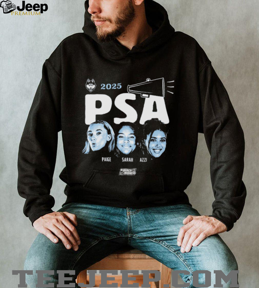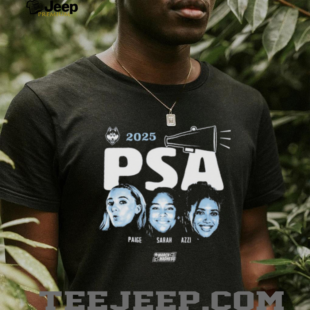 An “Official Paige Bueckers Sarah Strong And Azzi Fudd PSA UConn Huskies NCAA March Madness 2025 T-shirt” celebrates three key players who were instrumental in the UConn Huskies’ journey through the 2025 NCAA Women’s Basketball March Madness tournament, culminating in their national championship victory. The inclusion of “PSA” likely refers to their first initials, highlighting the collective star power and impact of Paige Bueckers, Sarah Strong, and Azzi Fudd on the team’s success. This officially licensed apparel would prominently feature the names and possibly images or jersey numbers of these three standout athletes, alongside UConn Huskies branding and the NCAA March Madness 2025 designation. It serves as a tribute to their individual talents and their combined efforts in leading the Huskies to the championship title.