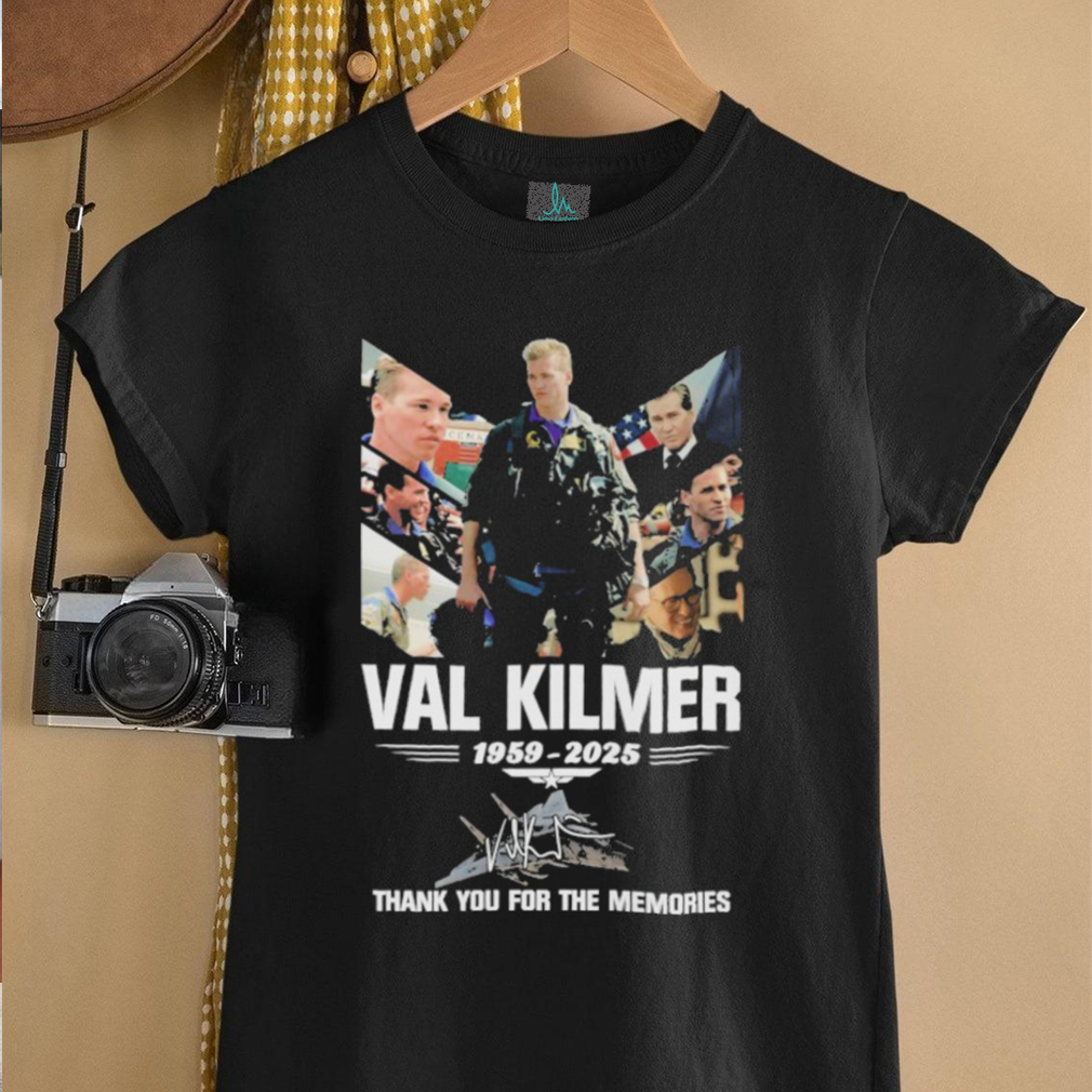 An “Official Val Kilmer Thank You For The Memories 1959-2025 Signature T-shirt” serves as a tribute to the life and career of the acclaimed actor Val Kilmer, who sadly passed away on April 1, 2025, at the age of 65. The shirt’s design would likely incorporate his birth and passing years, along with his signature, symbolizing a personal connection to his fans and his extensive body of work. This commemorative apparel allows admirers to remember his iconic roles in films such as Top Gun, The Doors, Tombstone, and Batman Forever, celebrating the talent and charisma he brought to the screen over several decades.