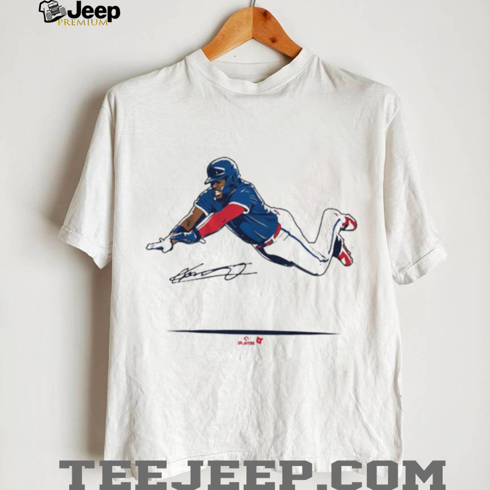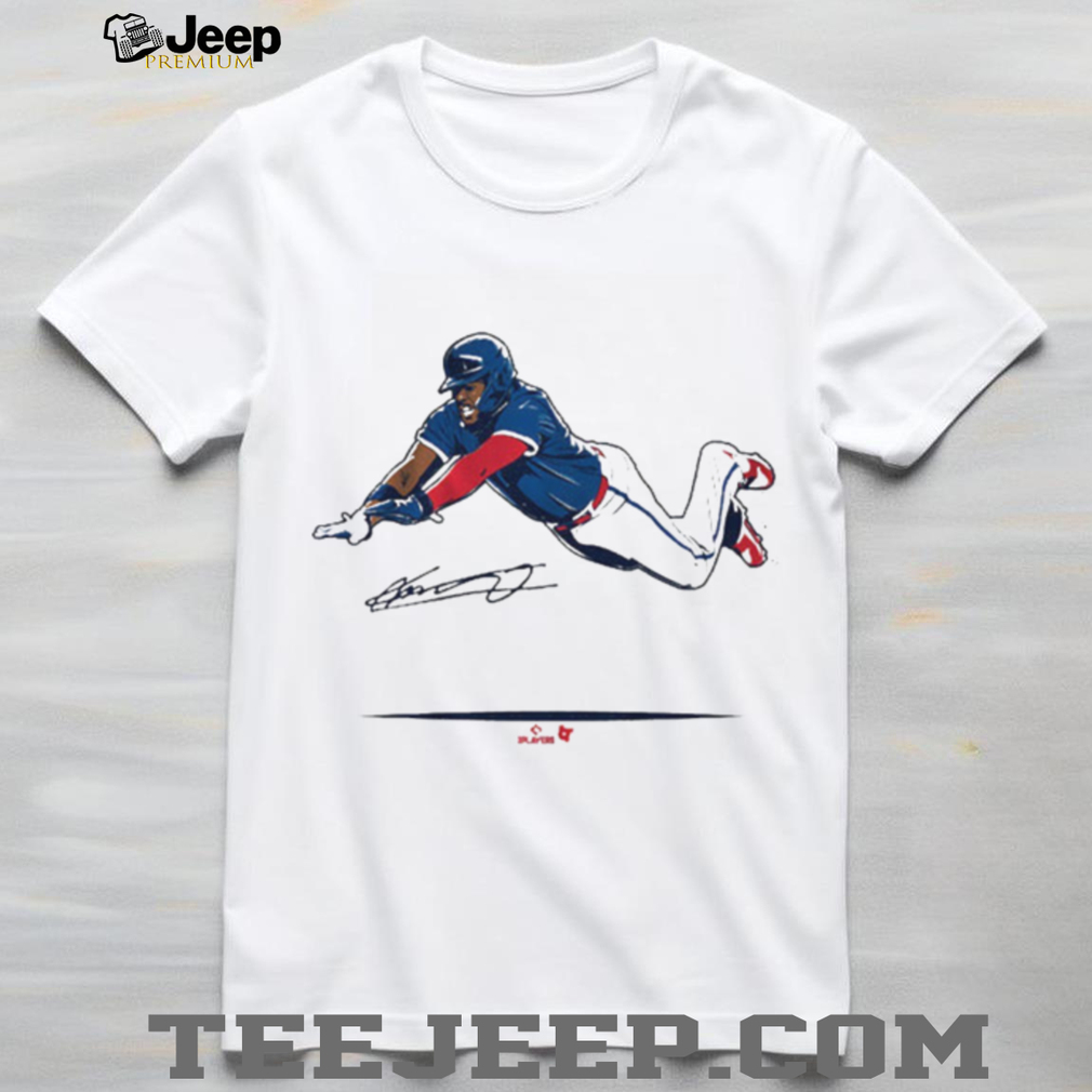 This Official Vladimir Guerrero Jr Super Vlad Flying Slide Toronto Blue Jays MLB Signature t shirt captures the energy and excitement that Vladdy Jr. brings to the game. Imagine yourself at the Rogers Centre, cheering on the Blue Jays while proudly displaying this unique tee. This shirt solves the problem of generic fan apparel by offering an officially licensed, signature design that showcases your passion for the team and its star player. Made with a comfortable cotton blend, this shirt is perfect for game day or everyday wear. Available in various sizes for a comfortable fit.