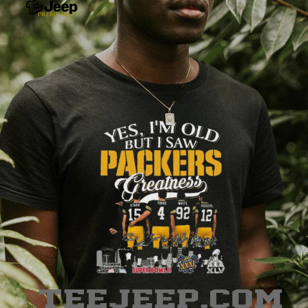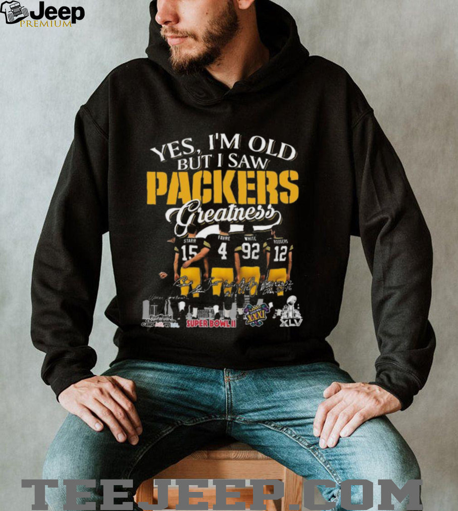 👕 About Official Yes I’m Old But A Saw Green Bay Packers Greatness Starr Favre White And Rodgers Legends Signatures 2025 Shirt