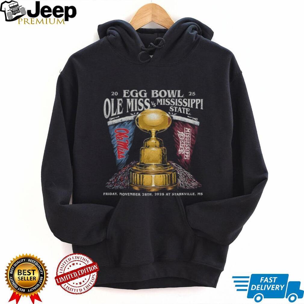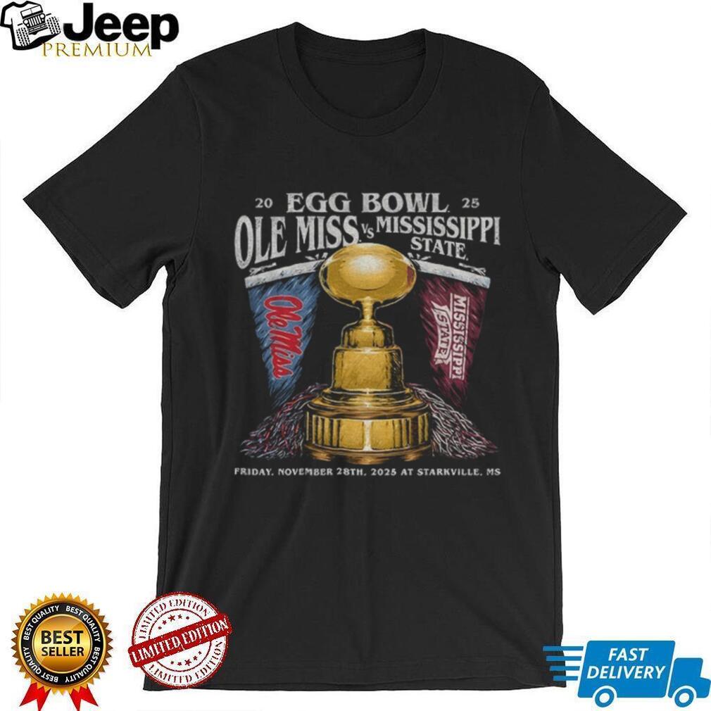 This Ole Miss vs Mississippi State Egg Bowl 2025 shirt is a must-have for any dedicated fan. Featuring a bold design that highlights the iconic trophy and the specific game details (Friday, November 28th, 2025, in Starkville, MS), it’s a detailed keepsake. Made from a soft, comfortable cotton blend, this tee is perfect for game day or everyday wear. Its classic fit ensures you can comfortably support your team. Show your pride for this historic rivalry with a shirt that’s built to last and designed to spark conversation among fellow fans.