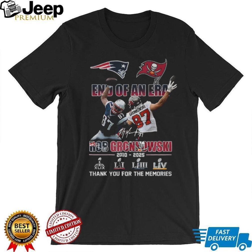 Pay tribute to a true NFL legend with this Rob Gronkowski “End of an Era” signature shirt. Featuring the New England Patriots and Tampa Bay Buccaneers, this tee celebrates Gronk’s incredible career and the memories he created. Perfect for die-hard fans who want to honor one of the greatest tight ends of all time. Thank you, Gronk!