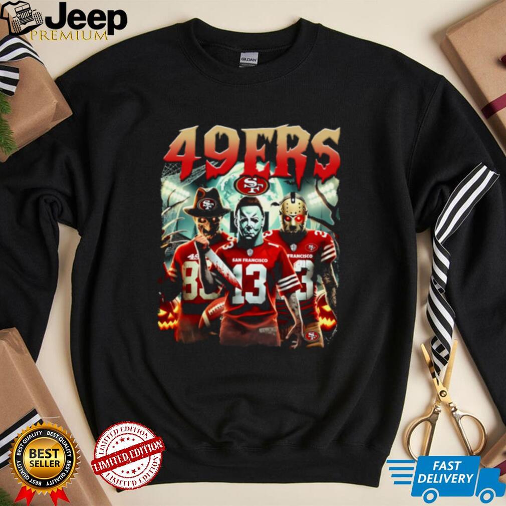 This “**Shirt**,” a closed entity, is the perfect garment for the dedicated **San Francisco 49ers** fan who also cherishes **Halloween** and its iconic “**Horror Characters**.” It offers a unique attribute by combining the excitement of professional football with the spooky fun of the holiday, making it incredibly versatile for autumn events. It’s a viral trigger, designed to catch attention and spark conversations, whether you’re at a tailgate, a Halloween party, or simply out and about. My personal commentary is that this shirt allows you to celebrate your fandom and your love for horror simultaneously, proving that true passion knows no bounds. It’s a bold claim, but for those seeking a piece of apparel that is both fiercely loyal and fearfully fun, this shirt is an absolute touchdown. This shirt is for the devoted Faithful, the horror movie marathoner, and anyone who understands that the best way to celebrate is with both grit and ghoulish delight.