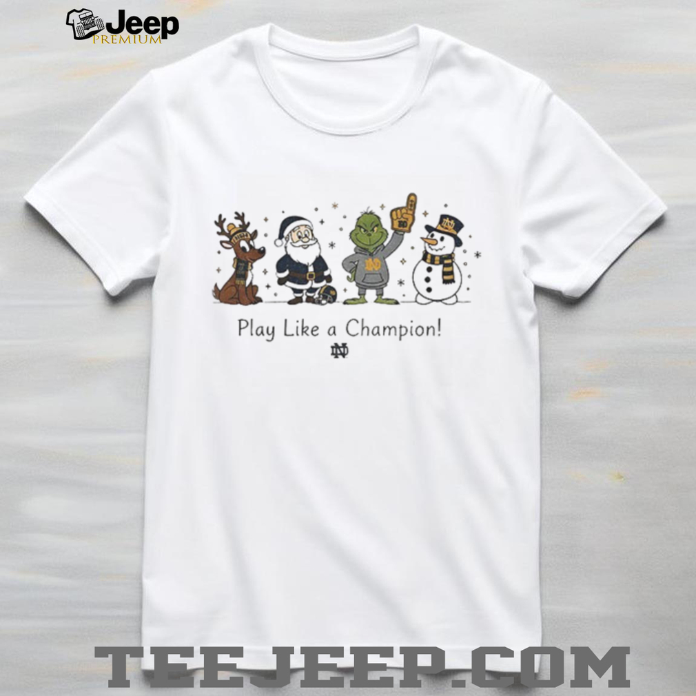Get into the holiday spirit with this Santa character Notre Dame Fighting Irish football play like a Champion Christmas shirt! This festive tee combines the iconic Notre Dame slogan with a jolly Santa twist. Perfect for Fighting Irish fans who want to celebrate Christmas with team pride.
