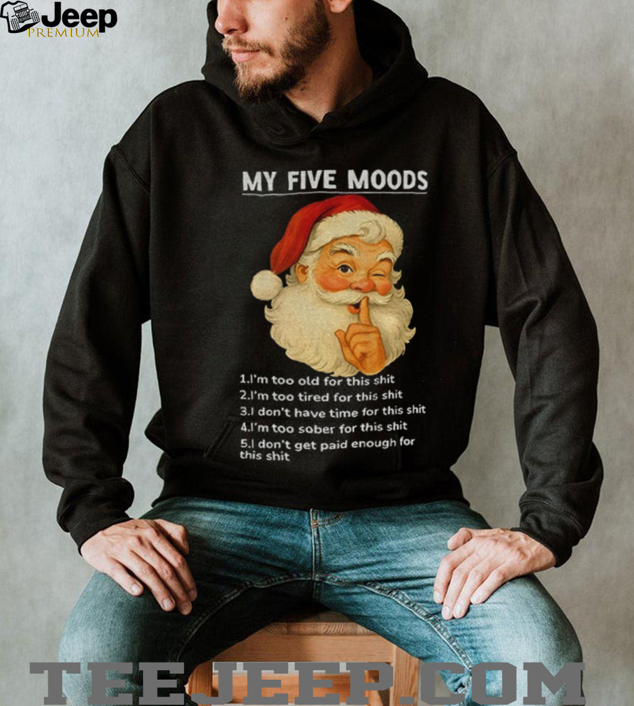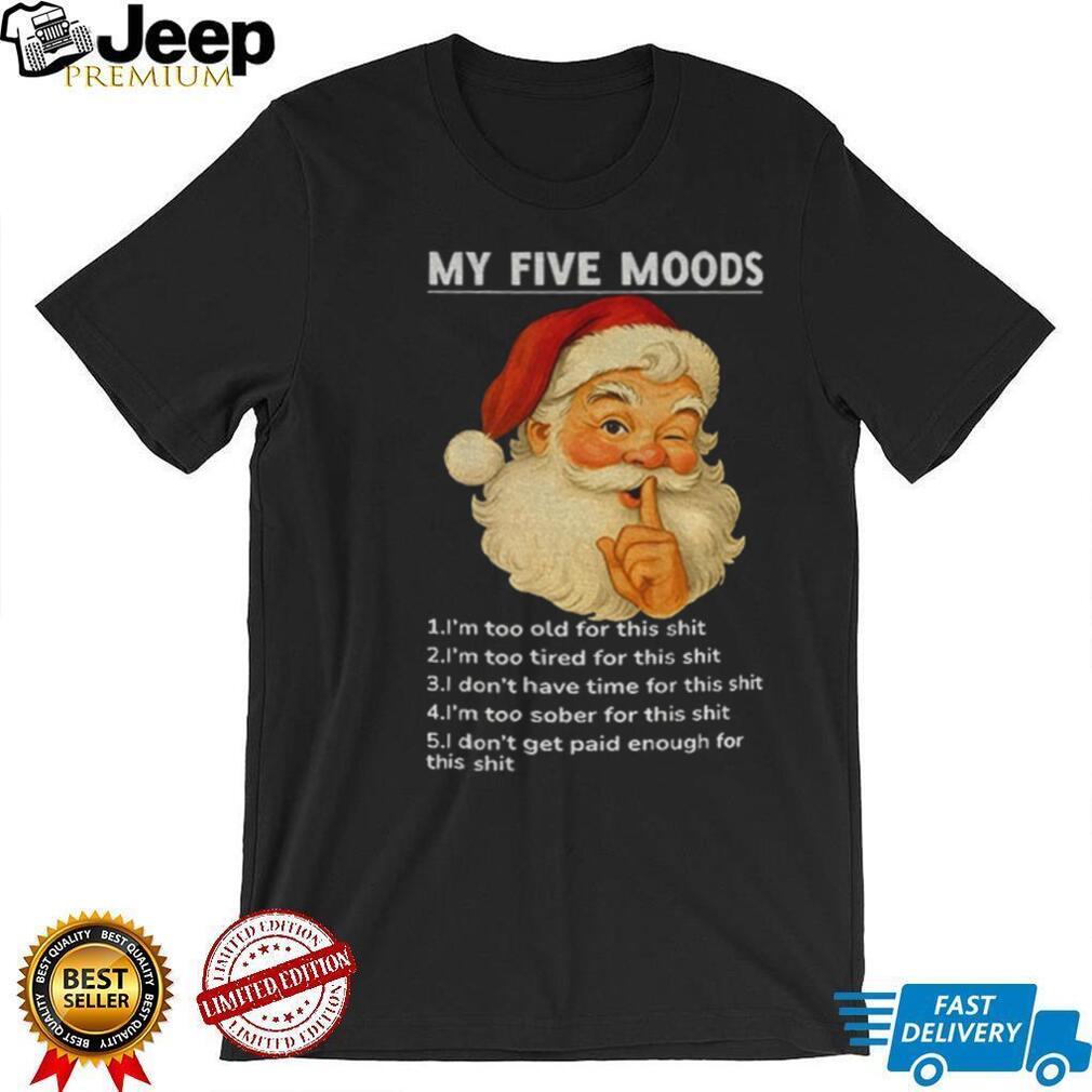 With each Santa Claus my five moods 1 I’m too old for this shit 2 I’m too tired for this Christmas shirt, you are contributing to creating a green tree.