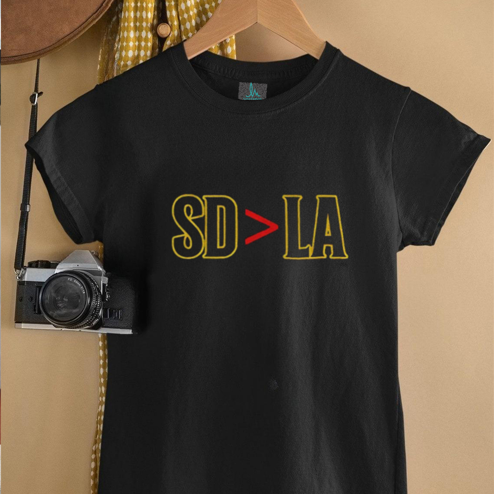 The “SD Greater than LA San Diego Padres Baseball shirt” is a piece of fan apparel that boldly proclaims the superiority of the San Diego Padres over the Los Angeles Dodgers in the realm of baseball. This shirt directly engages in the long-standing rivalry between the two Southern California teams, expressing a clear preference and a sense of dominance for the Padres. It serves as a statement of team pride and a bit of playful antagonism towards the Dodgers and their fans. The design prominently features “SD Greater than LA” along with San Diego Padres branding.
