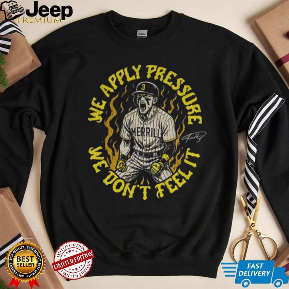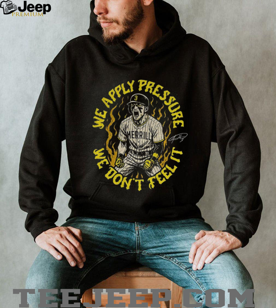 The “SD Padres Jackson Merrill We Apply Pressure We Don’t Feel It signature shirt” is a piece of fan apparel dedicated to the young and promising San Diego Padres player, Jackson Merrill. The central phrase, “We Apply Pressure We Don’t Feel It,” is a quote attributed to Merrill, encapsulating a confident and perhaps even fearless approach to the game, especially considering his status as a relatively new player in Major League Baseball. The inclusion of “signature shirt” suggests that the design may incorporate Merrill’s actual signature or a stylized representation of it, adding a personal touch for fans who admire his mindset and talent. This shirt serves as a way for fans to show their support for Merrill and embrace his confident attitude on the field.