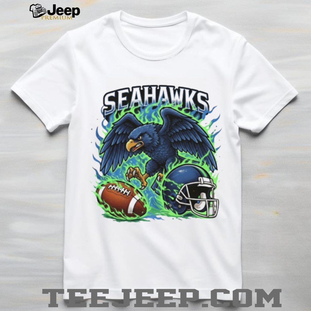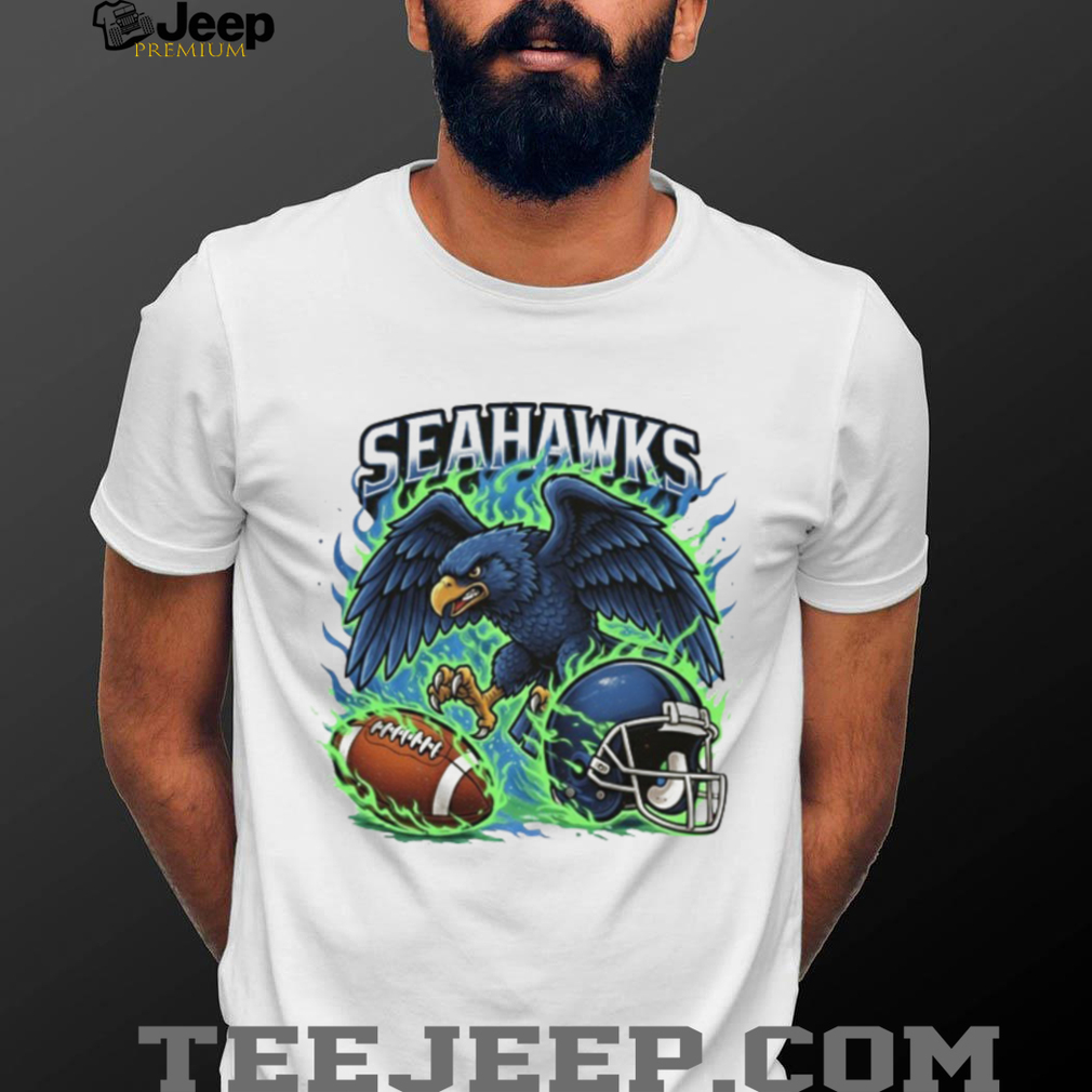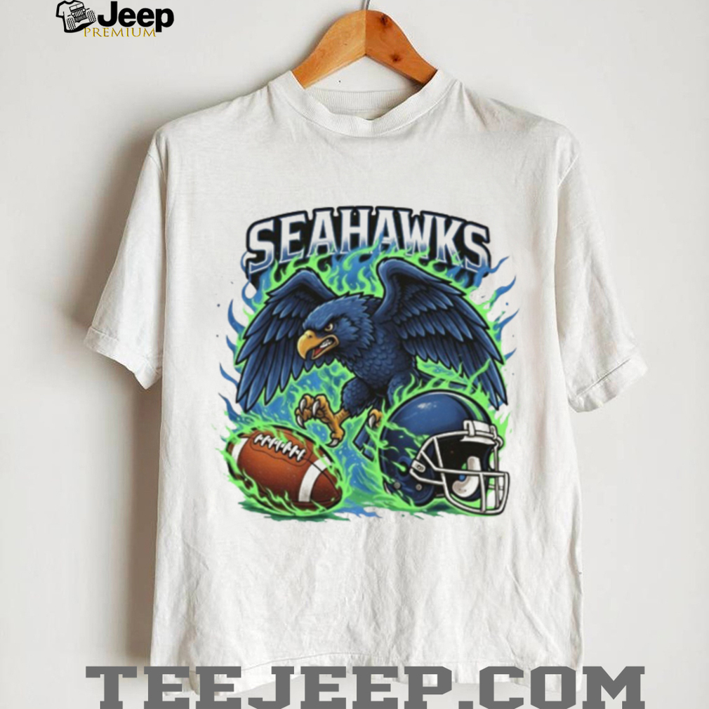 👕 About Seattle Seahawks Graphic Tee Fierce Hawk & Helmet Blue Flame Design