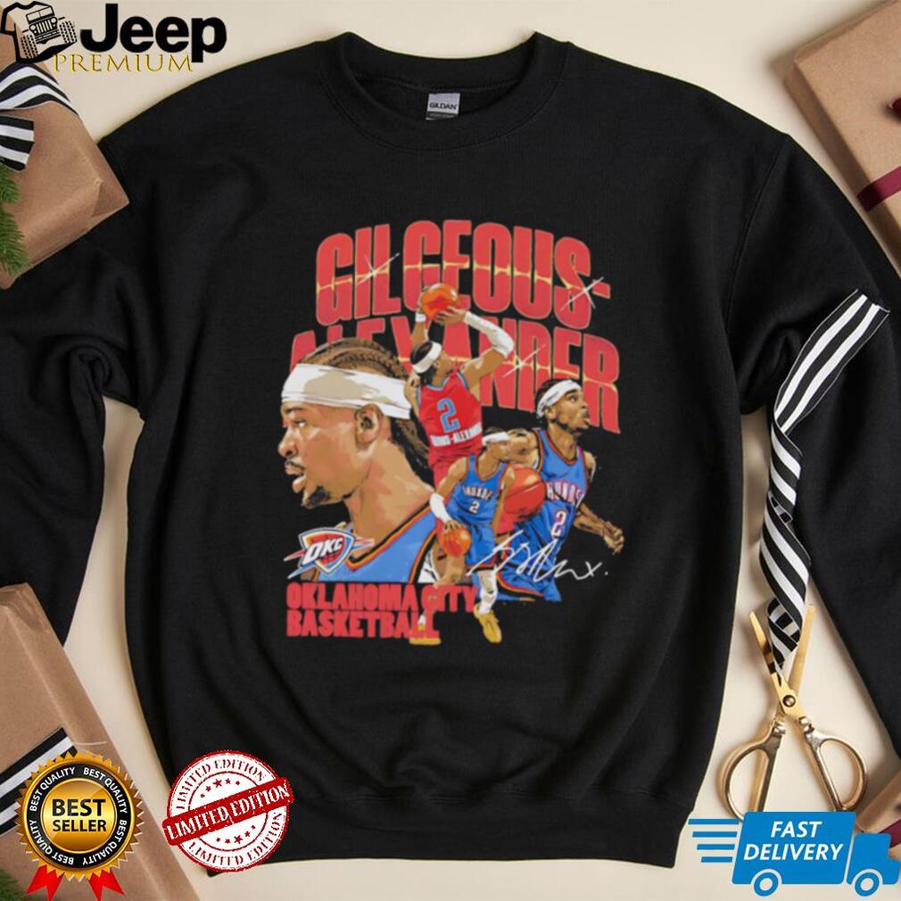 Witness the brilliance of Shai Gilgeous-Alexander, now in a wearable masterpiece! This Oklahoma City Thunder collage shirt is a visual symphony of his dazzling skills and iconic moments. Imagine a dynamic design bursting with SGA’s signature moves – the slithery drives, the smooth pull-up jumpers, the game-winning plays, all expertly arranged in a vibrant collage. This isn’t just a shirt; it’s a highlight reel you can wear, a testament to the electrifying talent that makes SGA a true force in the league. Sport this and be ready for knowing nods and “OKC!” shouts from fellow Thunder fanatics – you’re showcasing a rising superstar!
