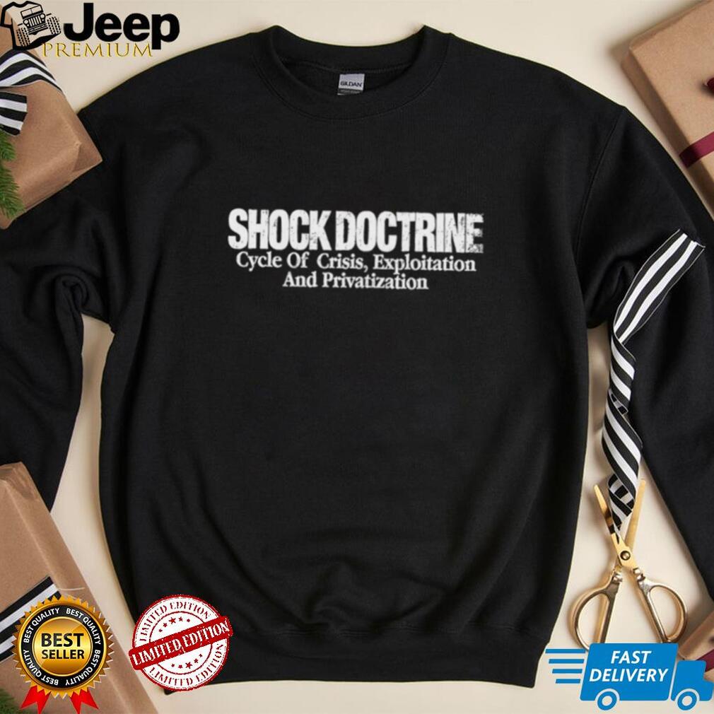 The prominent entities embedded in the title are the “**Shock Doctrine**” itself, a concept popularized by Naomi Klein’s 2007 book, and the core elements of this theory: **crisis**, **exploitation**, and **privatization**. The unique attribute here is the depiction of a “cycle,” suggesting a recurring pattern where crises are not just responded to, but strategically utilized for specific economic agendas. Klein’s book posits that proponents of neoliberal economics, particularly those influenced by Milton Friedman and the Chicago School, have historically used moments of collective shock to implement policies that systematically deepen inequality and enrich elites. This bold claim, backed by extensive research and case studies from around the world (e.g., Chile in the 1970s, post-Soviet Russia, and Iraq after the 2003 invasion), serves as a viral trigger, prompting critical examination of power structures. If you like to zoom in this way, the shirt’s graphic might visually represent this cycle: perhaps a storm cloud (crisis) morphing into a corporate logo (exploitation/privatization), or a series of interconnected gears illustrating the systematic nature of the doctrine. For another shirt with a powerful message, consider this Superman Black Adam We Should Talk Shirt, delving into complex character dynamics.