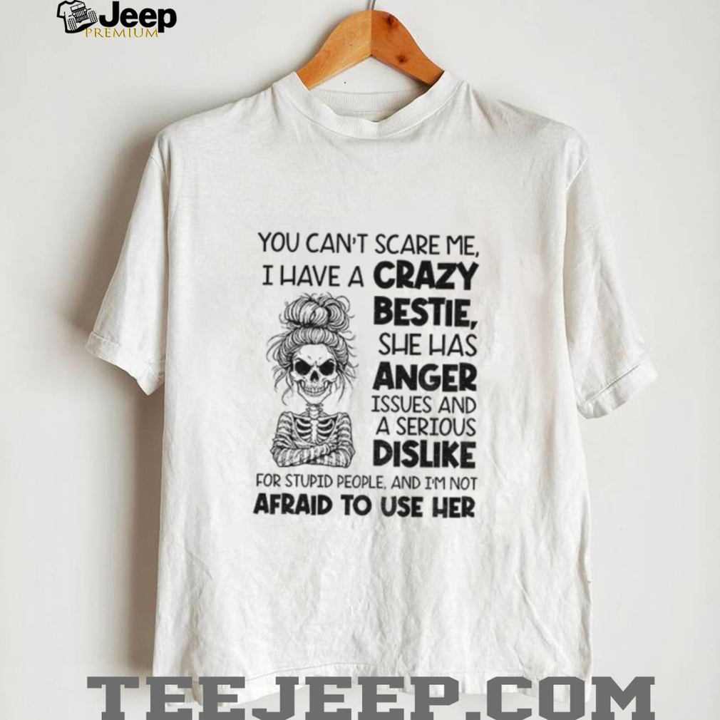 Celebrate your unbreakable bond with your crazy bestie with this hilarious “Skeleton Girl” shirt! Featuring a skeleton girl and the saying “You can’t scare me, I have a crazy bestie, she has anger issues,” this tee is perfect for showing off your friendship and warning the world about your bestie’s fiery side. It’s a fun and edgy way to express your appreciation for your BFF!