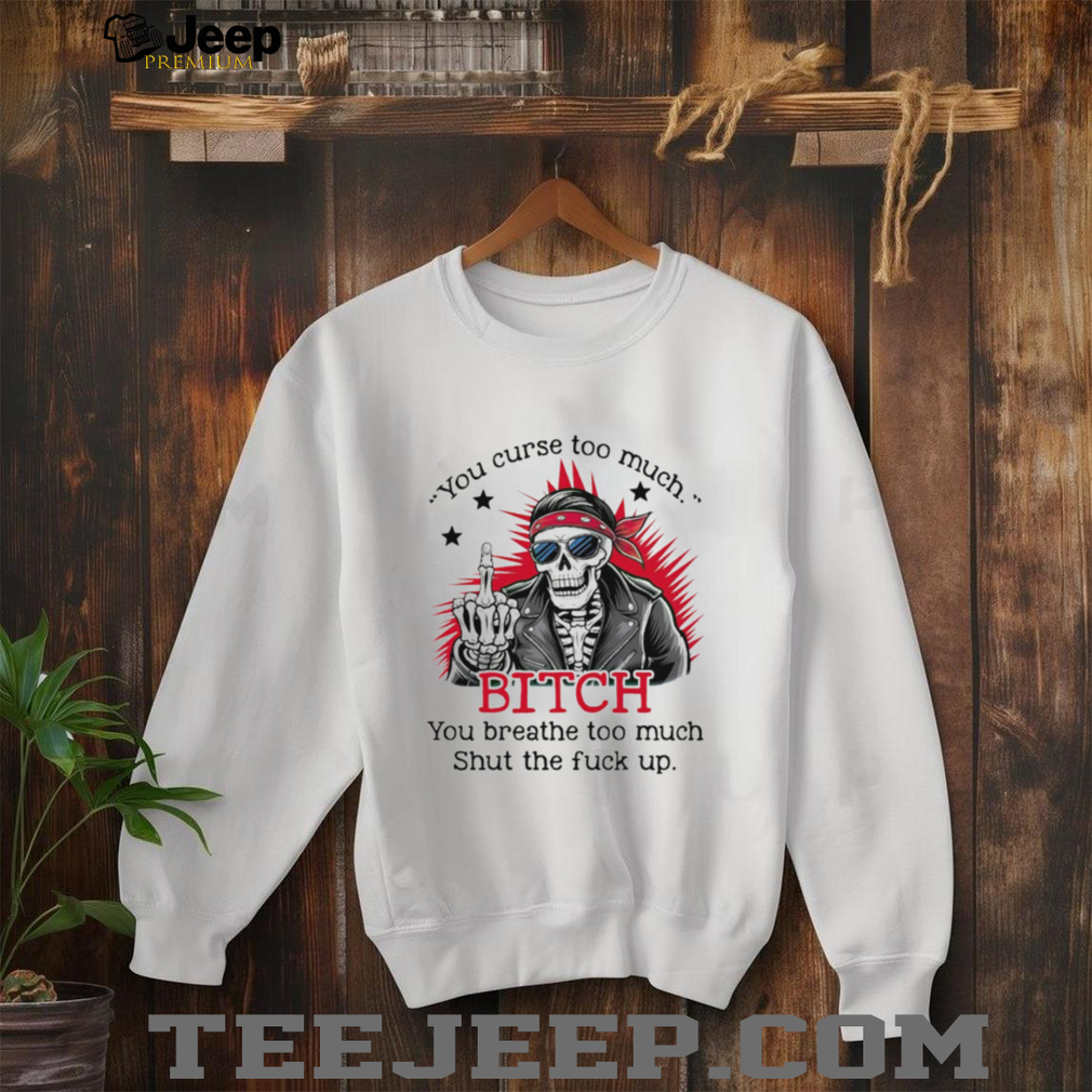 The “Skeleton You Curse Too Much Bitch You Breathe Too Much shirt” is a piece of apparel that combines a skeleton graphic with a darkly humorous and provocative statement. This shirt aims to be edgy and attention-grabbing, using a combination of morbid imagery and harsh language. The phrase is intended to be confrontational and absurd, creating a sense of dark humor. The design would prominently feature a skeleton graphic and the quoted phrase.