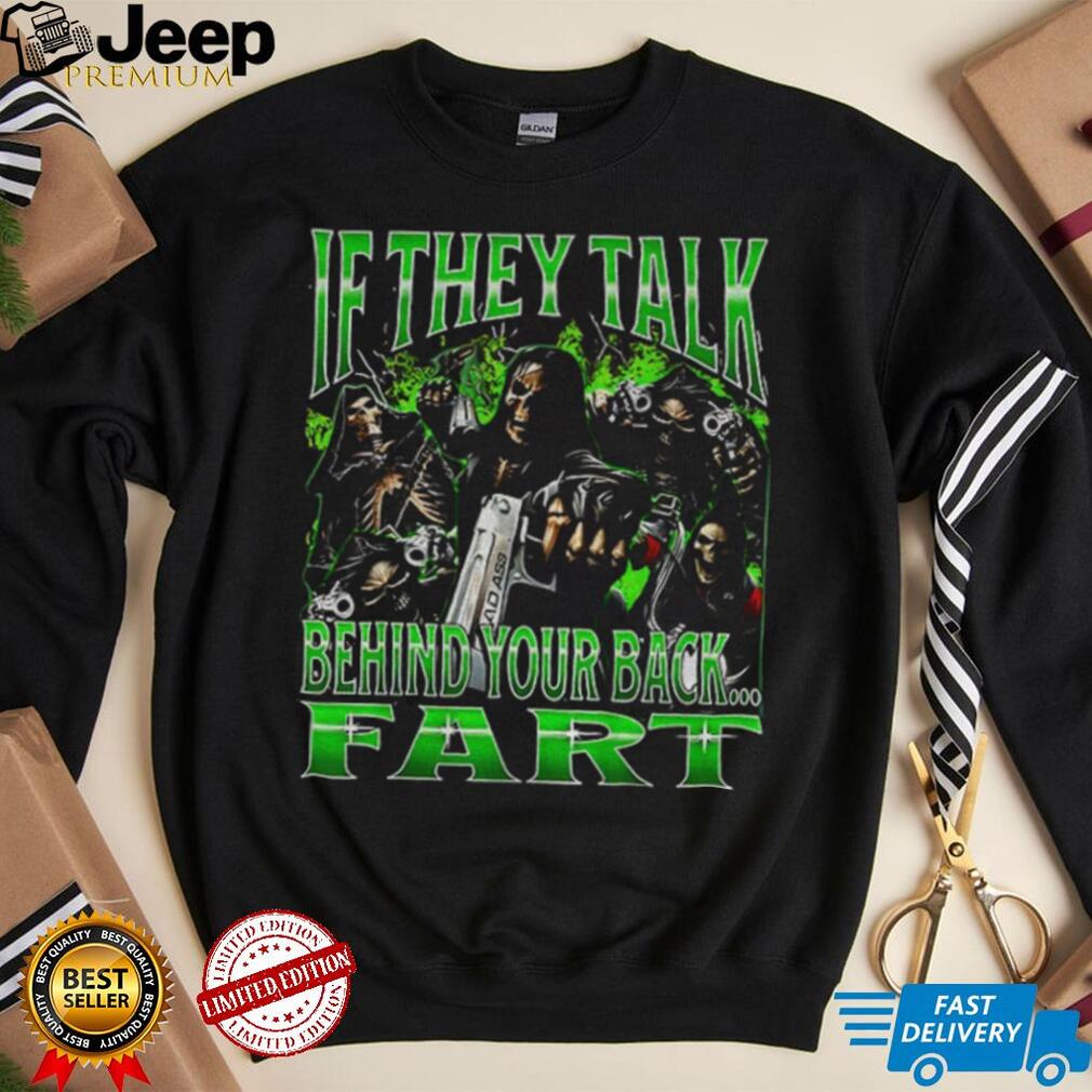 A “Skeletons if they talk behind your back fart shirt” presents a darkly comedic and absurd scenario. It plays on the common idiom of people talking negatively about someone behind their back, juxtaposing it with the literal image of skeletons, which are inherently silent and lack the biological capacity to fart. The humor arises from this incongruity and the visualization of a skeletal figure engaging in such a humanly embarrassing act as a consequence of gossiping. It’s a silly and slightly morbid joke that subverts expectations and uses the imagery of skeletons in an unexpected and humorous way.
